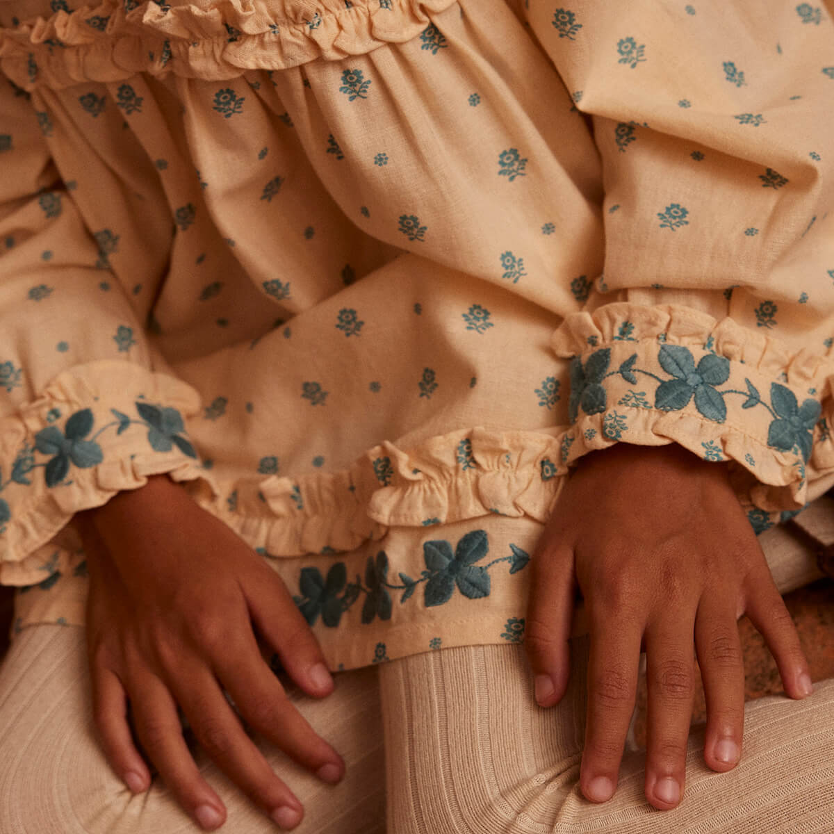 Pernille Dress by Apolina. Pernille is the prettiest new dress in the season’s ‘meadow calico’ rustic cotton-linen. With sweet ruffles trimming the neckline, chest, cuffs and hem, we love Pernille’s 1960s mood for parties and special occasions. Featuring sweet floral embroideries at cuffs and hemline. Button through closure at back. We love her worn with boat shoes for an effortlessly elevated look.