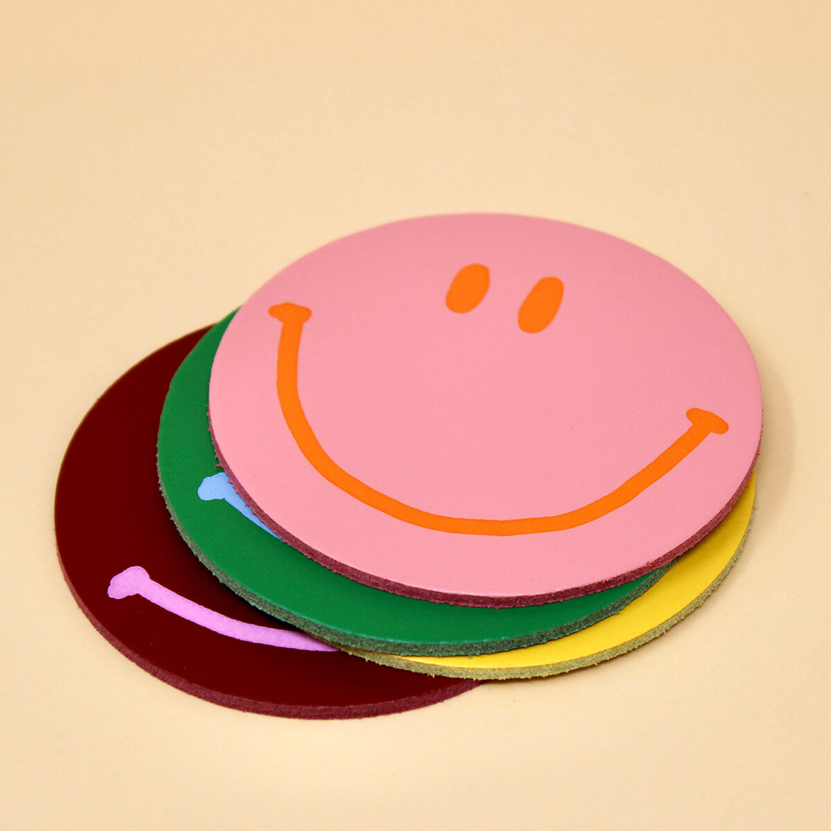 Set of Four Happy Face Coasters by Ark Colour Designs. Four colourful smiley face coasters made in genuine leather.