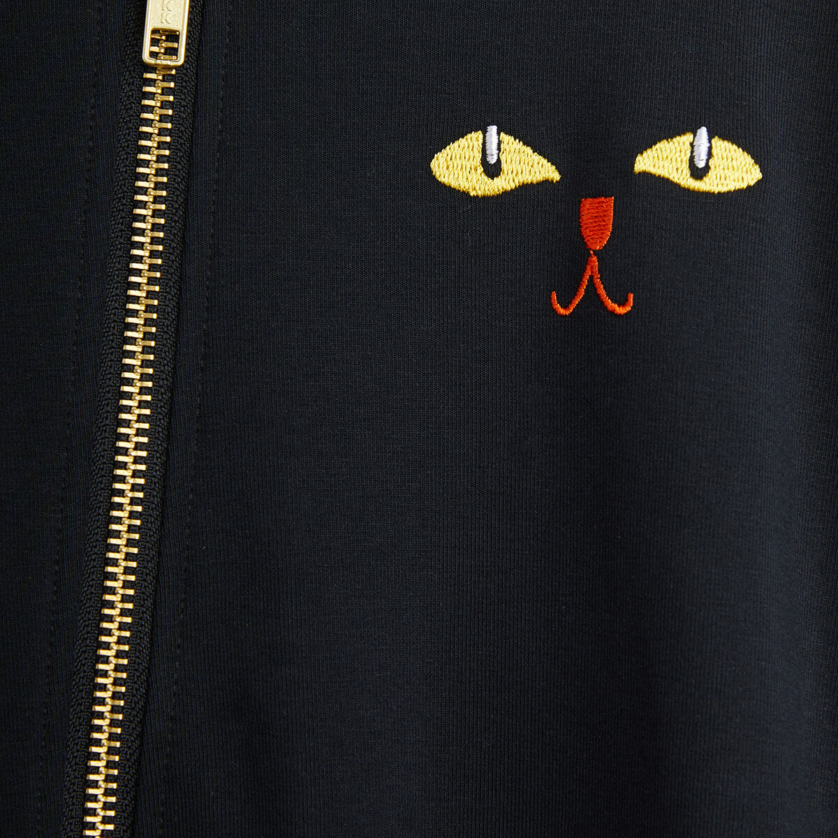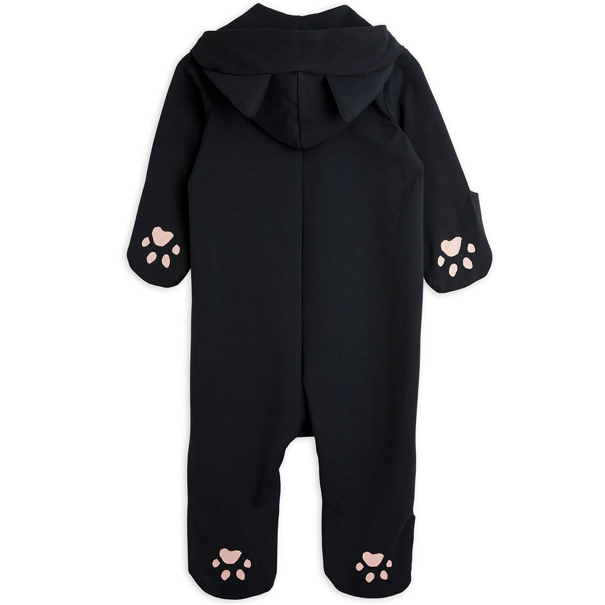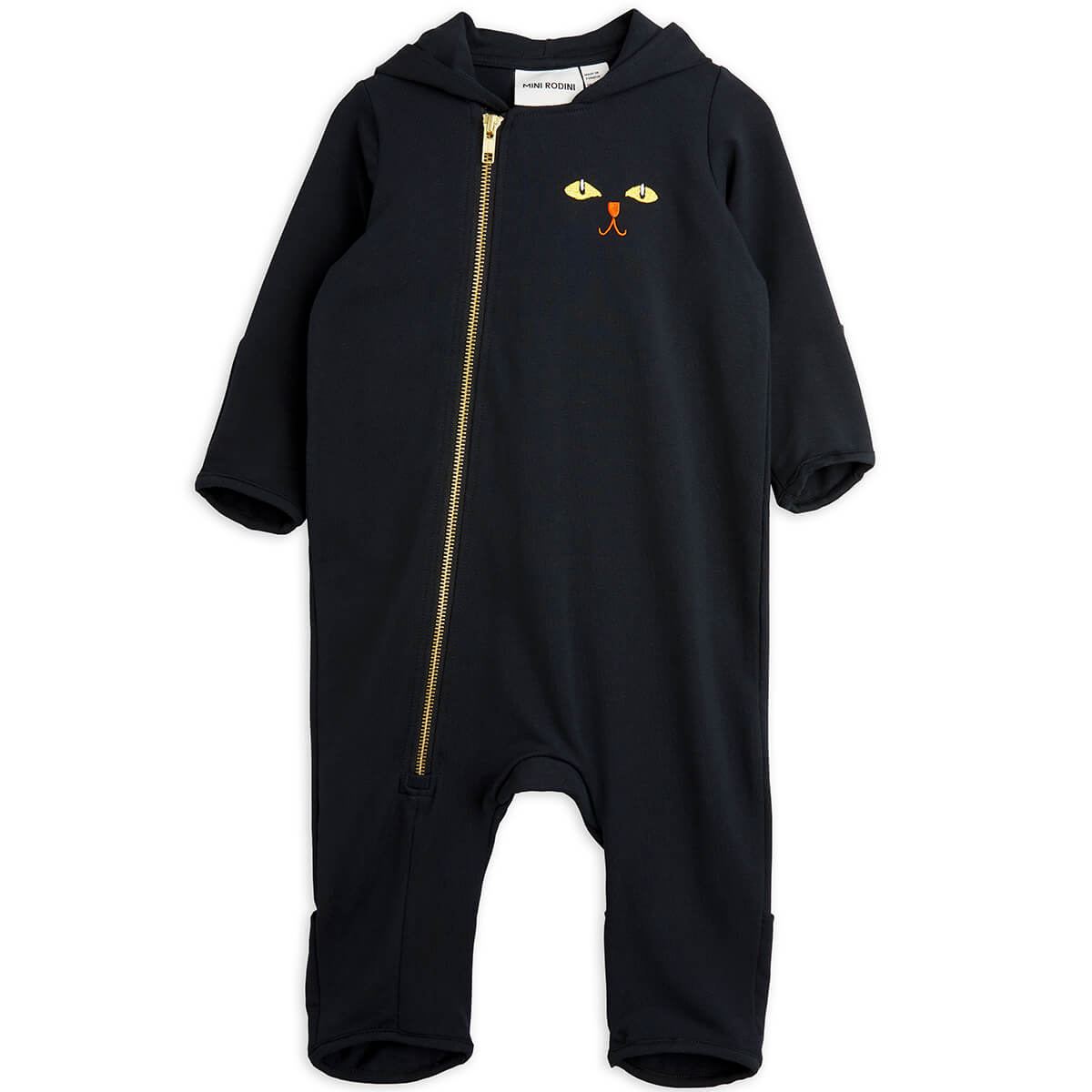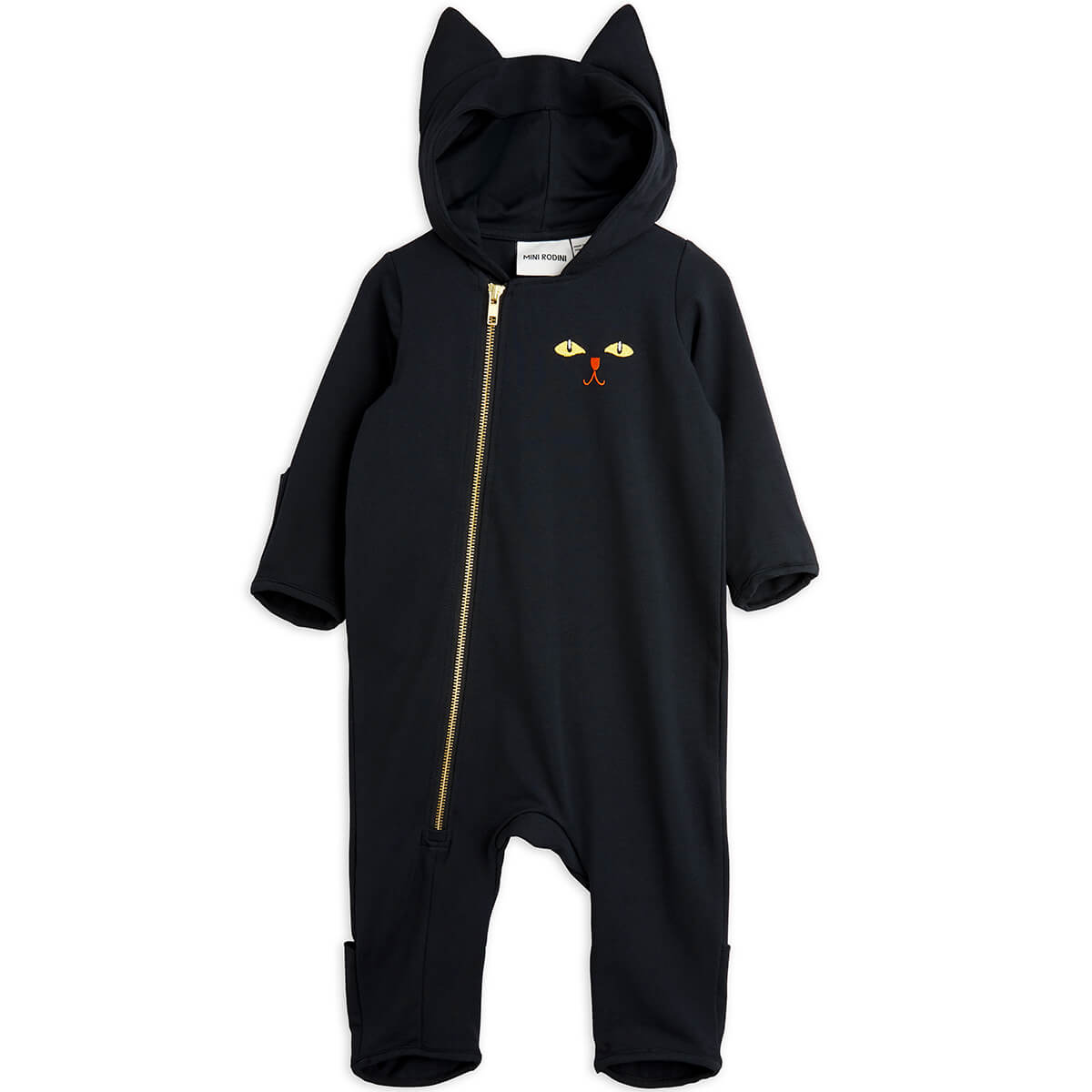 Catsuit baby onesie by Mini Rodini. A zip front baby onesie with cat ears on the hood and embroidered cat fast on the chest. Cat prints on the hands and feet.