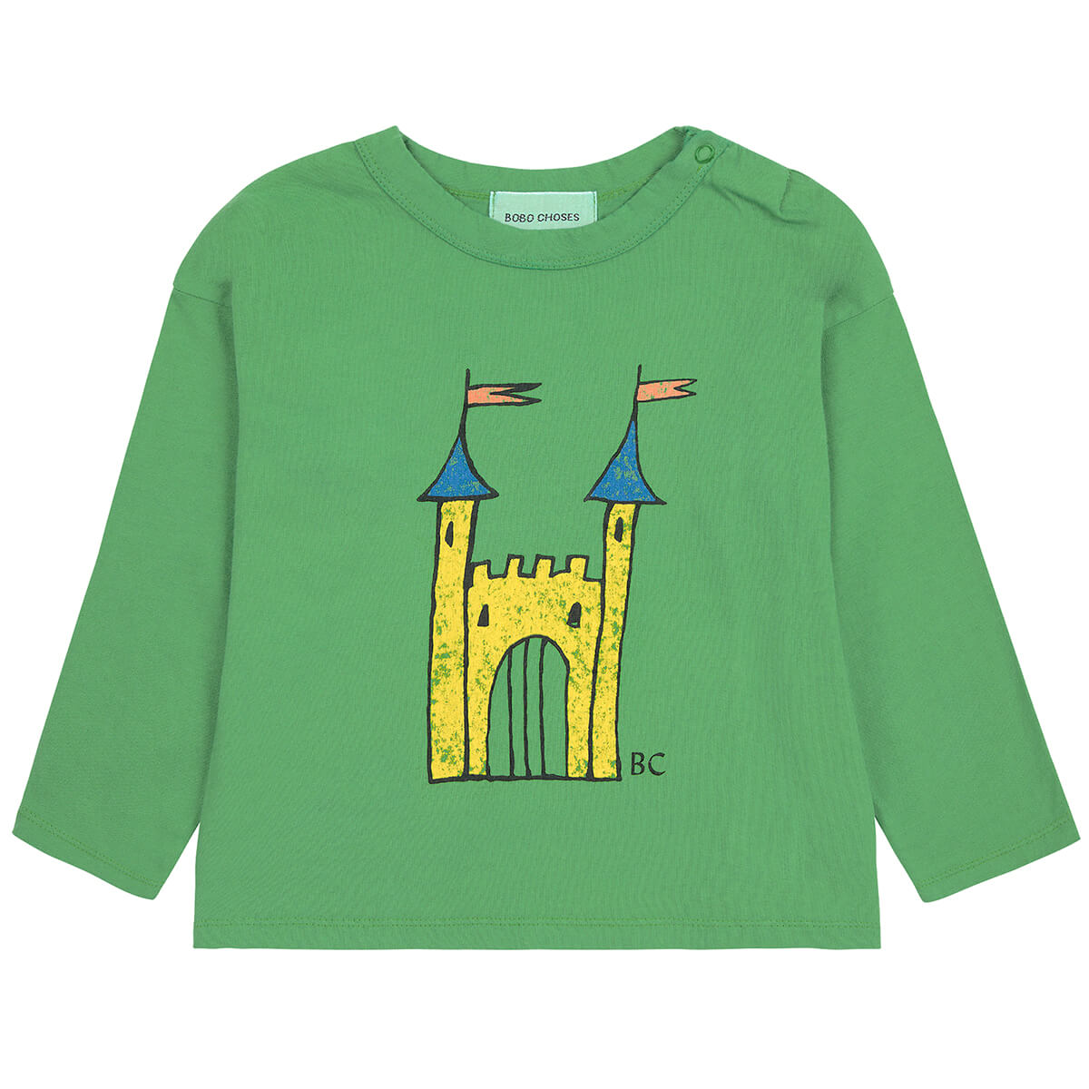 Faraway castle baby t shirt by Bobo Choses. A long sleeved cotton top with this season's fun graphic print. Features snap fastening at the shoulder for easy dressing.