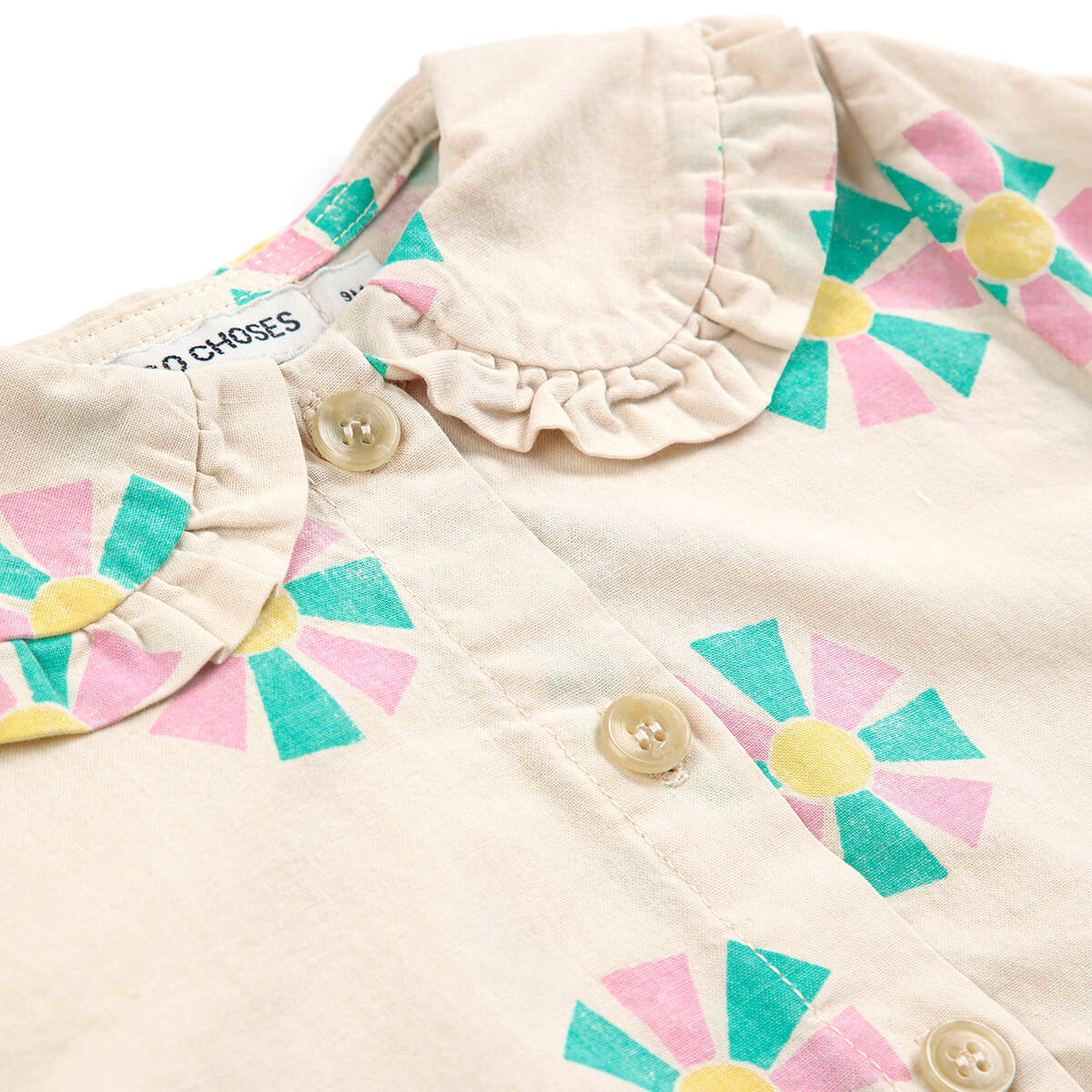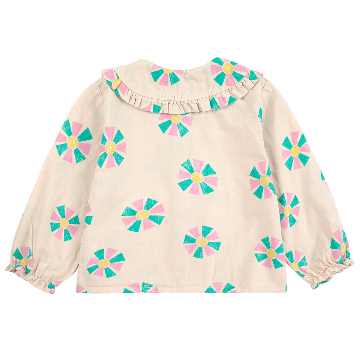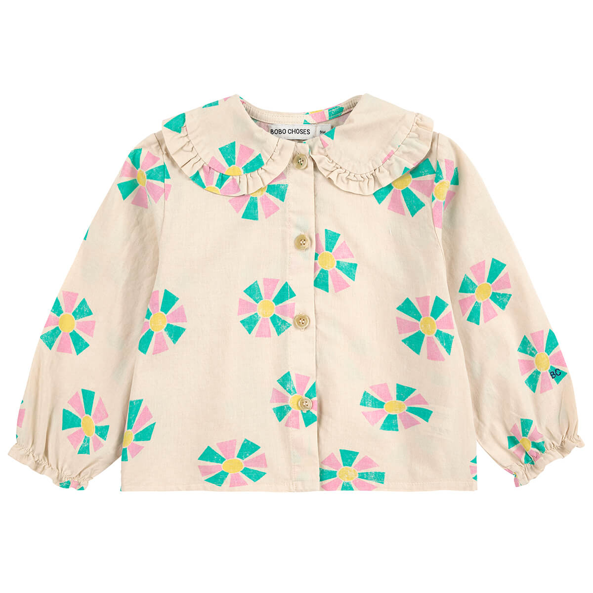 Kaleidoscope All Over Baby Blouse by Bobo Choses. Light and breezy this playful cotton top combines comfort and style. Made in 100% organic cotton, it features a ruffle trimmed peter pan collar, button fastening, elasticated cuffs and a loose fit.