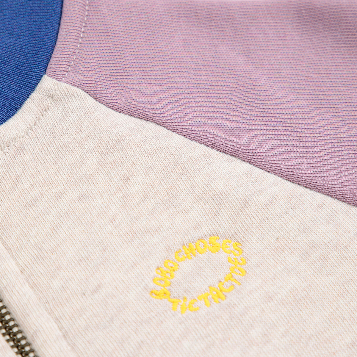 Tic Tac Toe Colour Block Zipped Baby Sweatshirt by Bobo Choses. Stylish and practical, this lavender zipped sweatshirt is a wardrobe essential for those cooler days. Designed with elasticated cuffs, a loose fit, a kangaroo pocket and fleece, it's made to bring comfort to everyday adventures.