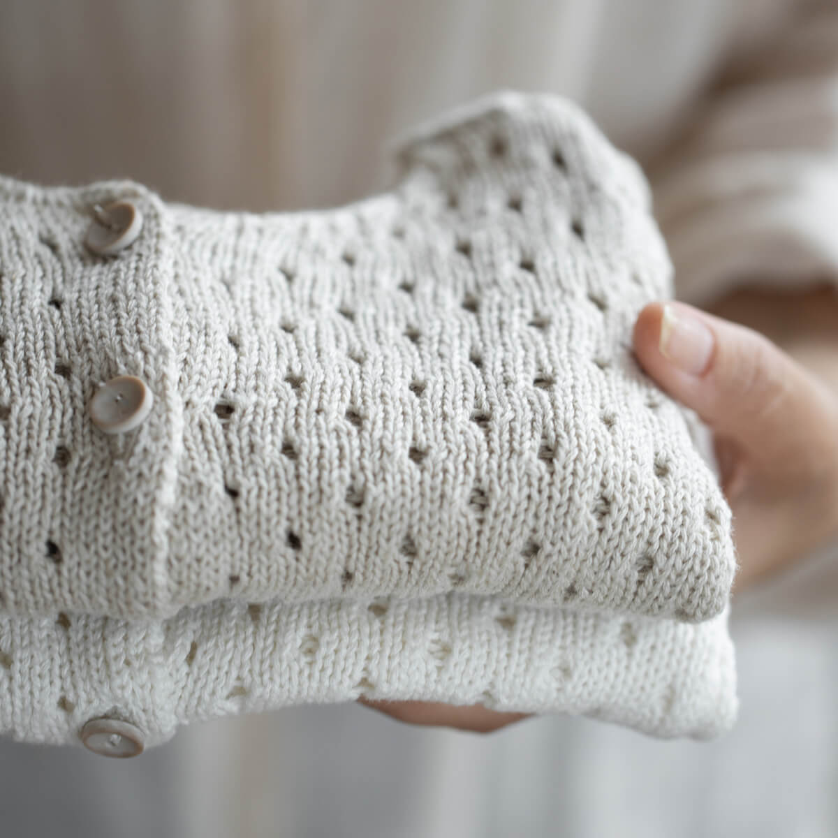 Telma Cardigan by 1+ in the Family. A soft knit baby cardigan in a cool linen blend with wooden buttons.