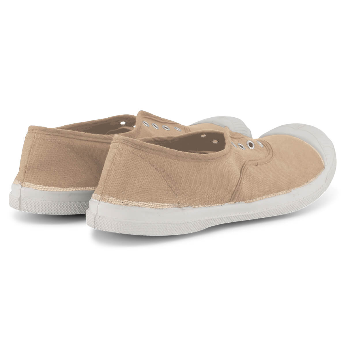 Women's Elly slip on tennis shoe by Bensimon. The original Bensimon laceless tennis plimsolls with eyelets and elasticated front. This slip-on style is easy to put on and quick to take off. Thin and lightweight sneakers made from rubber and natural cotton. Every shoe is hand-dyed in Bensimon's workshops in France, meaning every pair has its own variations and is completely unique.