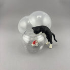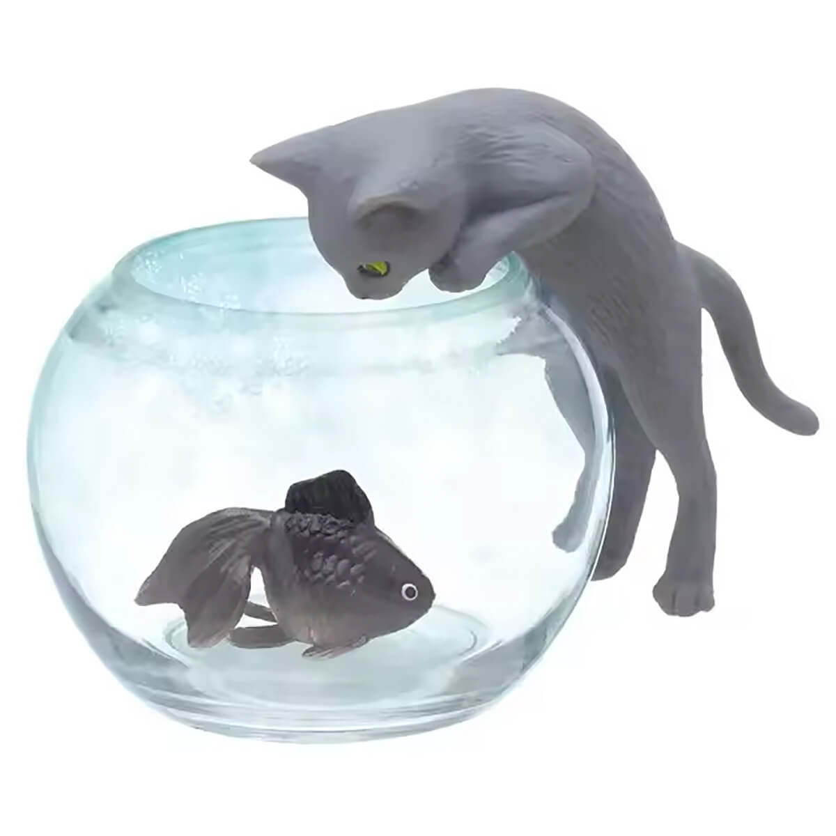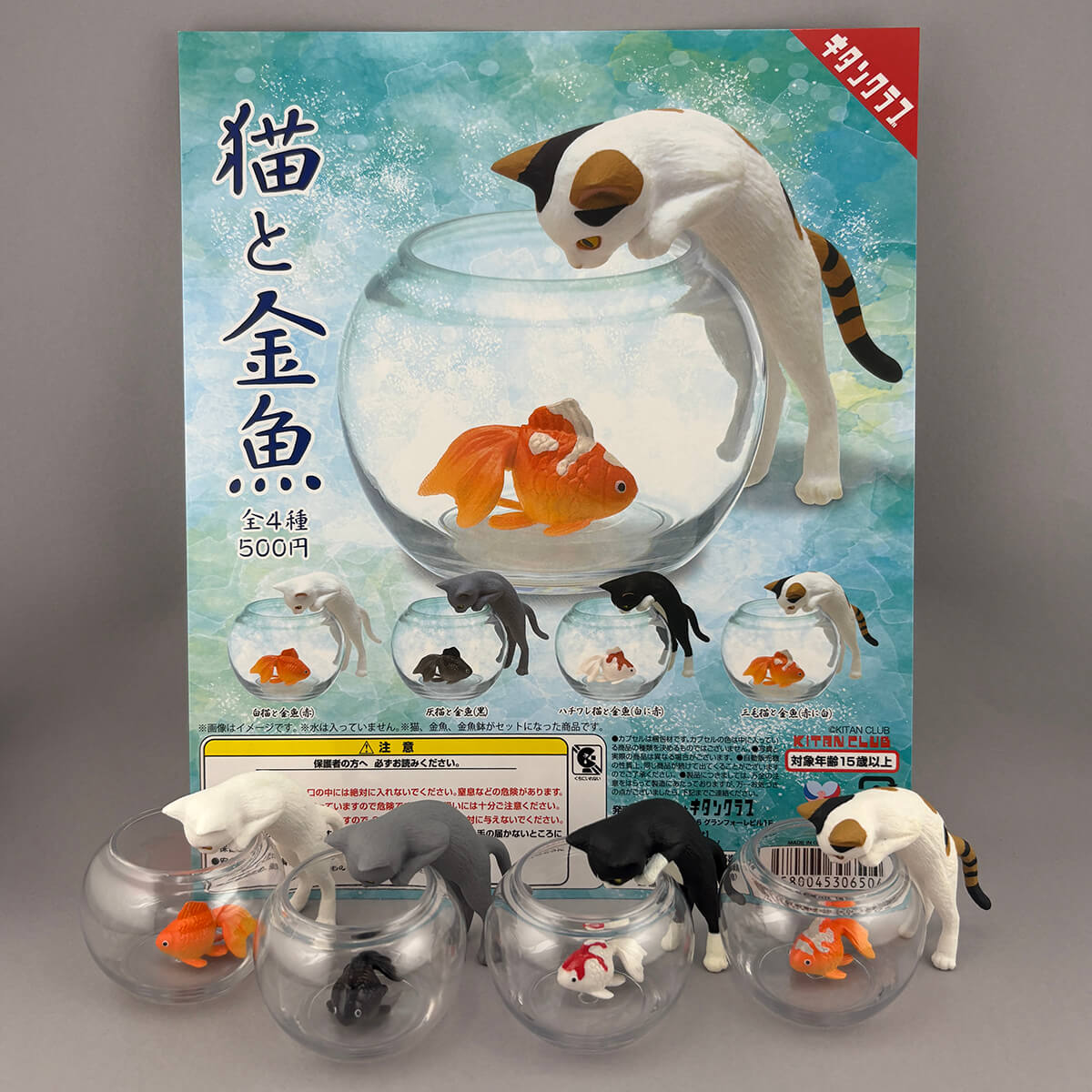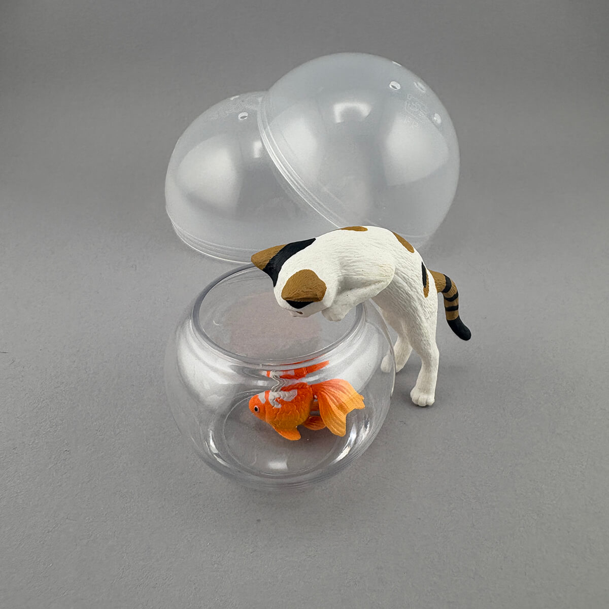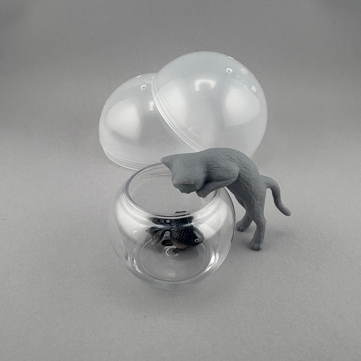 Cat And Goldfish Gachapon Capsule Collectible by Kitan Club. Highly collectible and authentic Japanese gachapon capsule containing one of four different cat and goldfish bowls. Just add water to complete the miniature display. The capsule forms the bowl, and the cat observes the goldfish swimming inside.