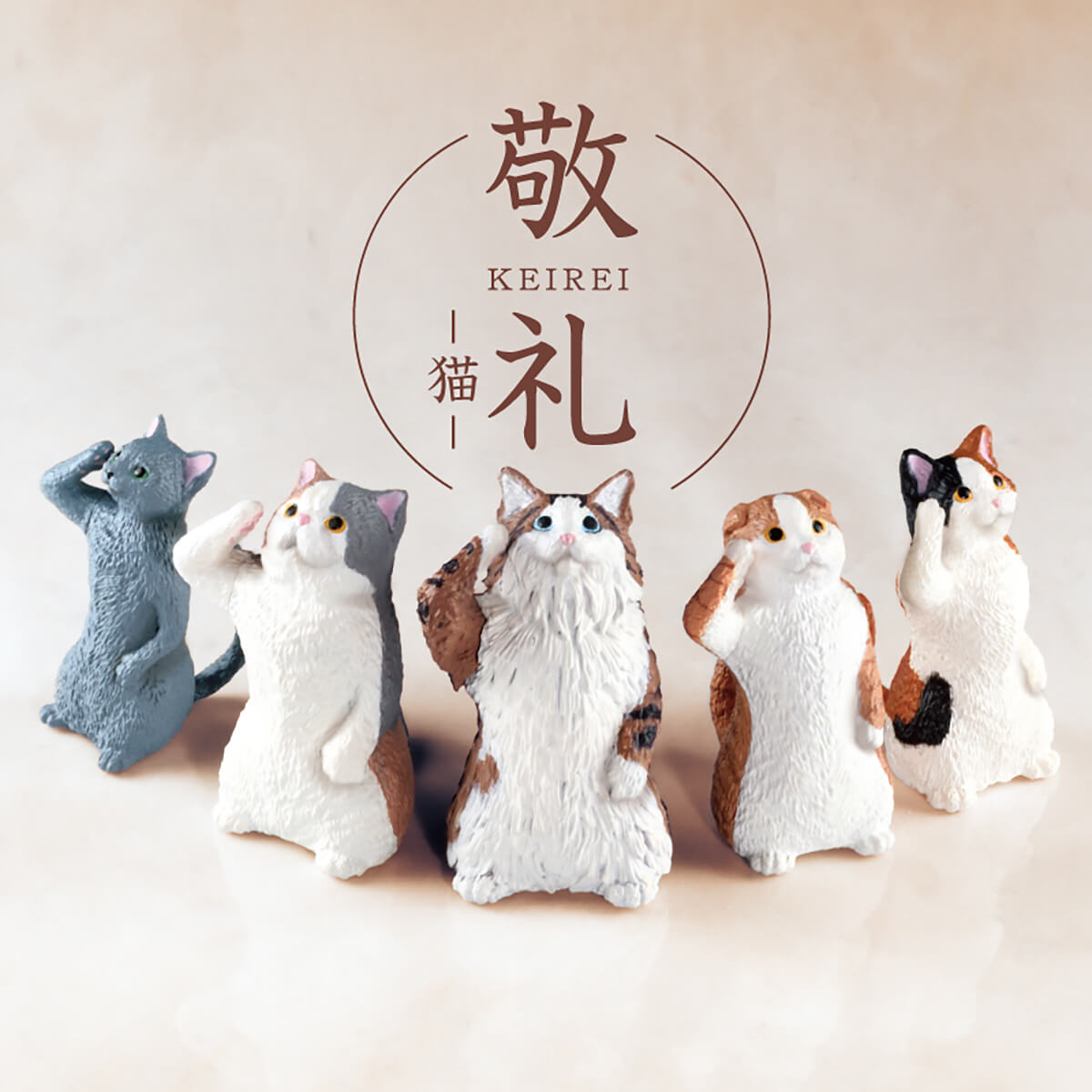 Salute Cat Blind box by Yell Japan. This is a cat version of the popular Salute series from Yell World. Cats of all sizes stand motionless in a salute pose! Add some cheer to your workspace or bookshelf with these fun saluting cats. They're the purrfect decor and the envy of your social feed. Collect all five cats and line them all up in a row as a mini cat army!