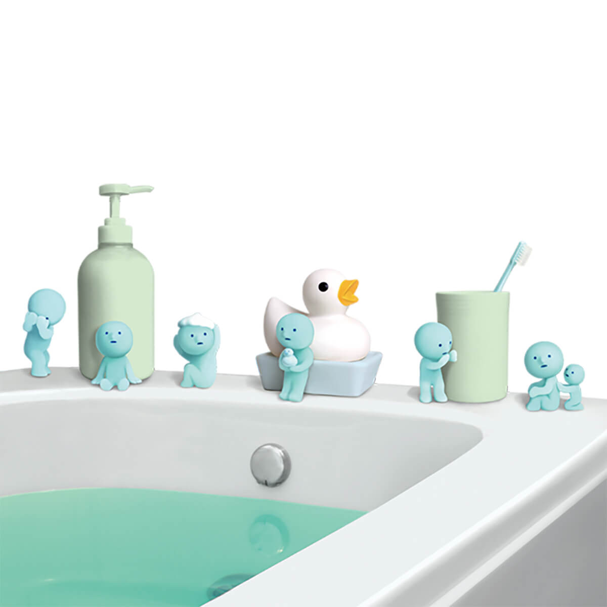 Smiski Bath Series collectable dolls. Smiski is a curious little creature that loves hiding in small spaces and corners of your room. Although they like to stay hidden, you might recognize at night as they mysteriously glow in the dark. In the Bathroom and Toilet series, a new blue Smiski has been found in the corners of the bathroom! This series has a blue colour and is made of the same phosphorescent material that makes Smiski glow! Look out for Smiski Shampooing, Smiski With Duck and Smiski Scrubbing, with a tiny Smiski helping to scrub his back!