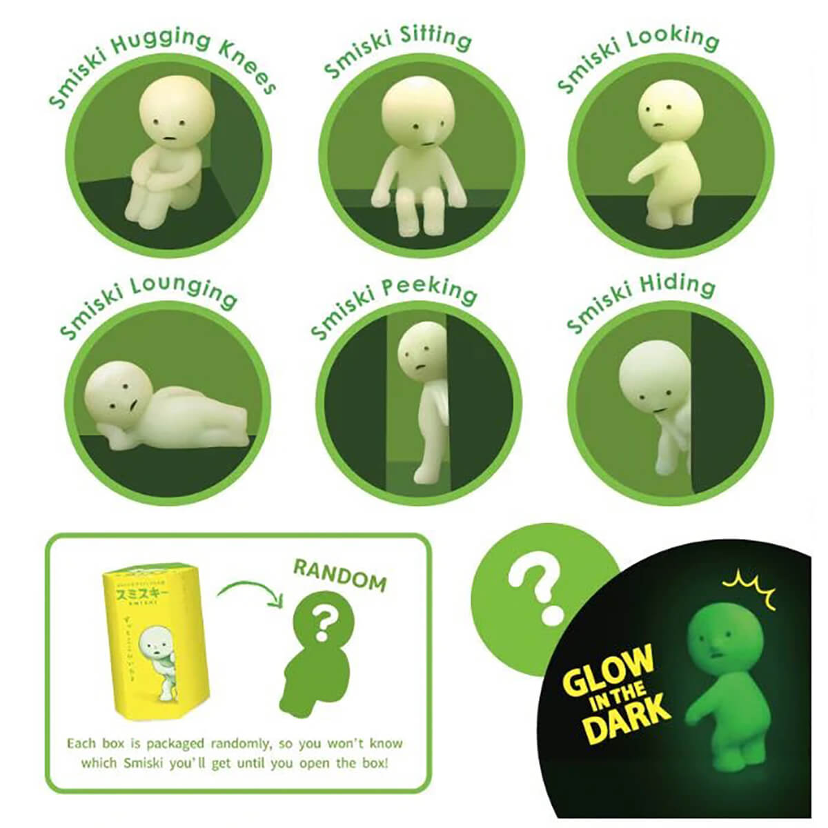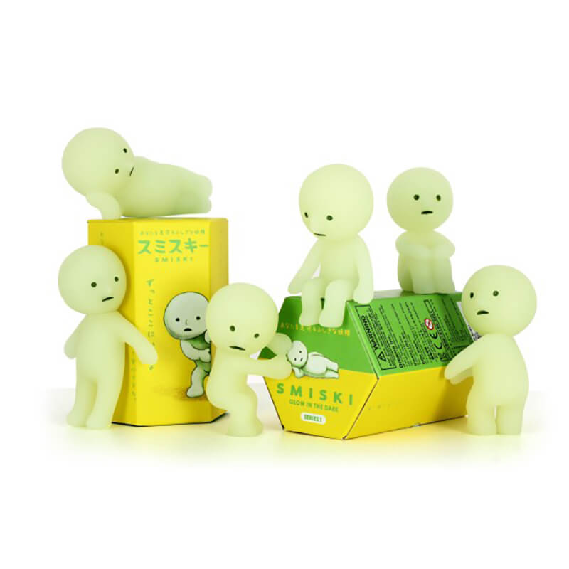 Smiski Series 1 collectable dolls. These six adorable little glow in the dark creatures will live hidden in the corners of your house: behind a book, on a shelf or a desk.