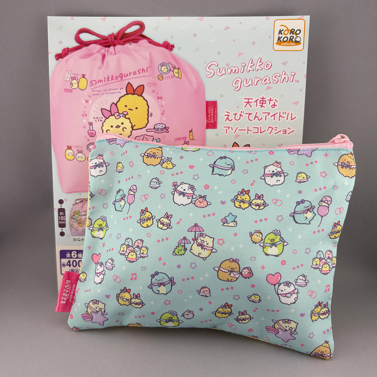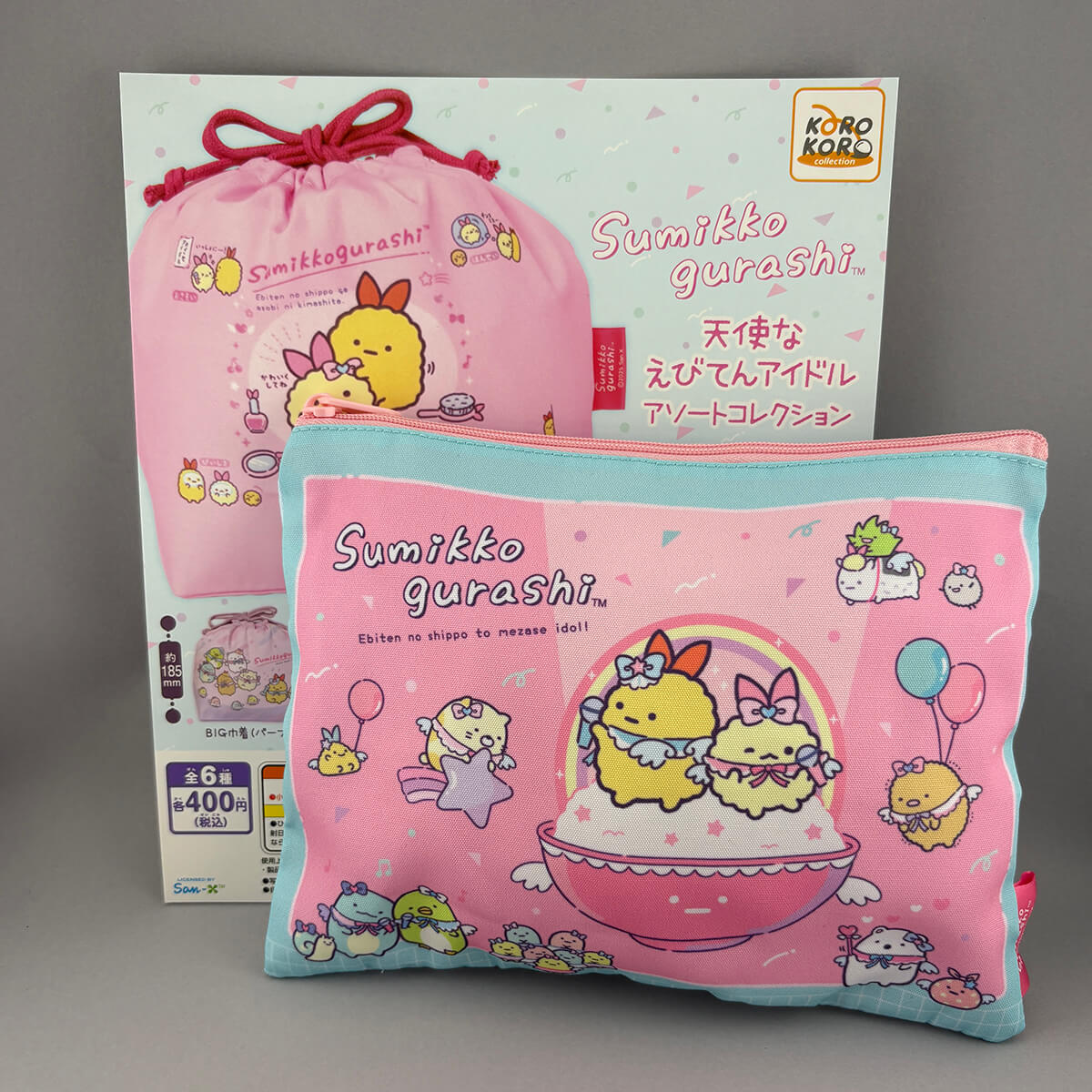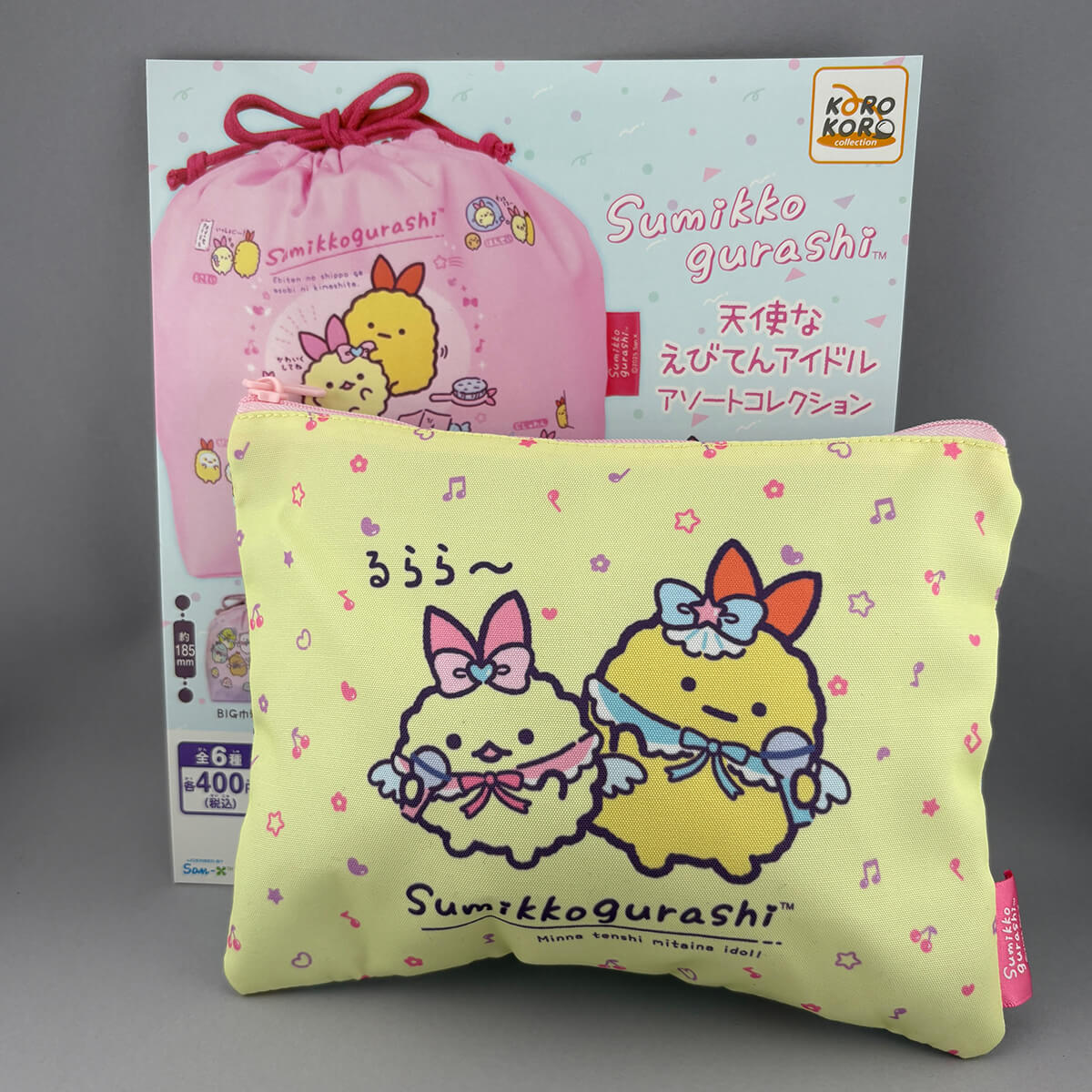 There are six different Sumikko Gurashi pouches to collect, featuring Ebiten no Shippo, who was leftover from a tempura donburi bowl, and dreams of being an idol. The story goes: One day, Tonkatsu came back with a friend who looked like Ebifurai no Shippo. This friend was Ebiten no Shippo. "I hope one day I can stand on the stage I've always dreamed of..." Ebiten no Shippo is working hard to achieve their dream.