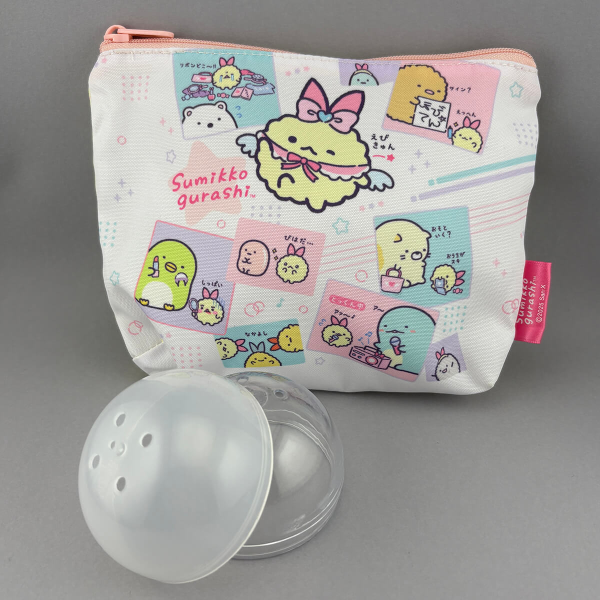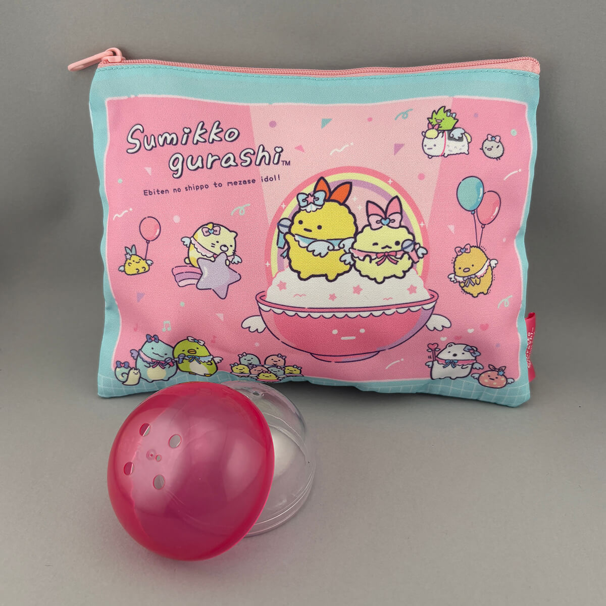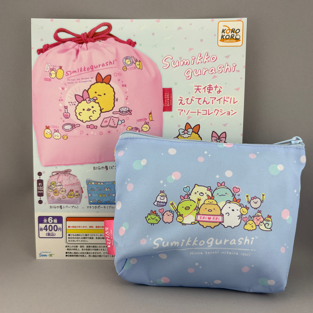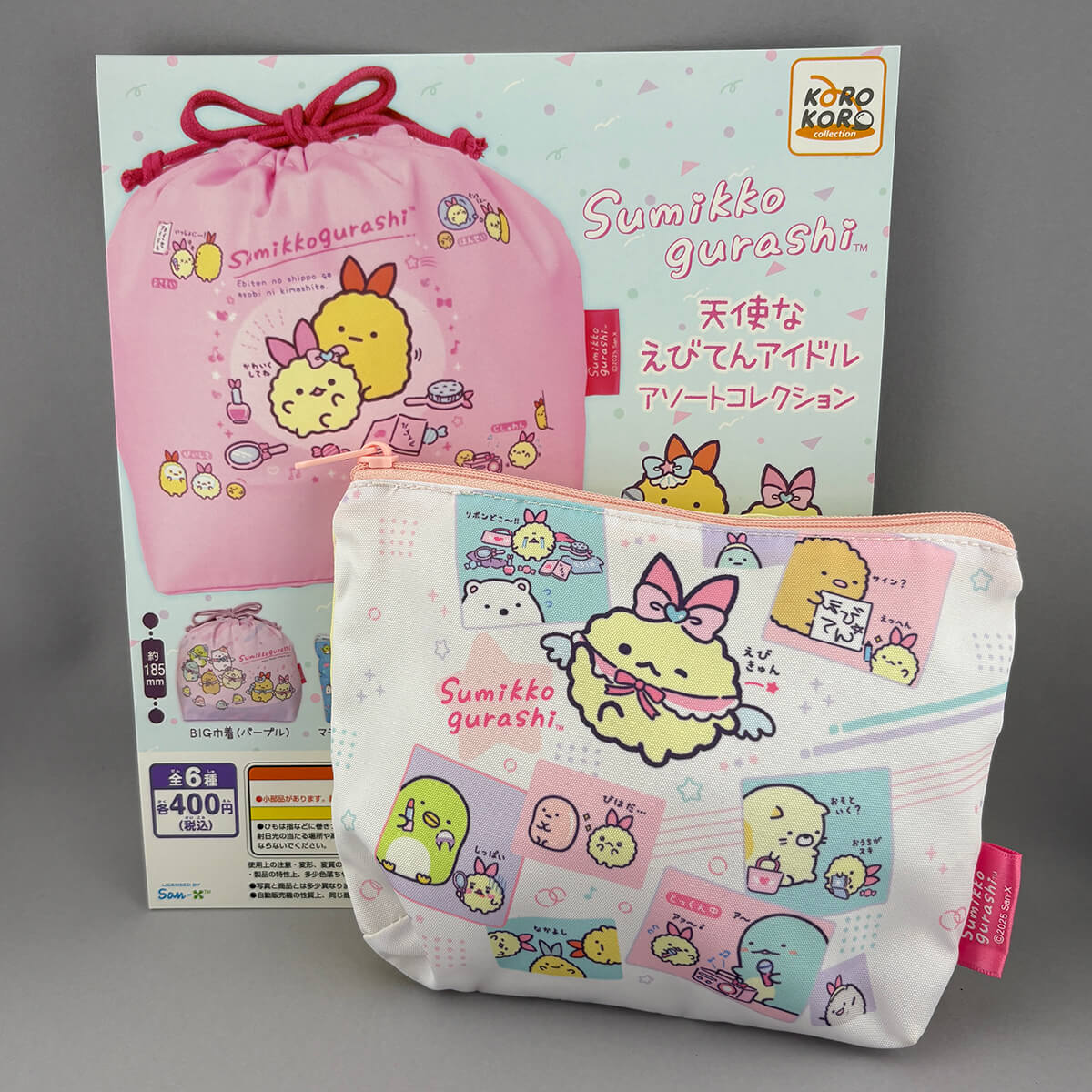 There are six different Sumikko Gurashi pouches to collect, featuring Ebiten no Shippo, who was leftover from a tempura donburi bowl, and dreams of being an idol. The story goes: One day, Tonkatsu came back with a friend who looked like Ebifurai no Shippo. This friend was Ebiten no Shippo. "I hope one day I can stand on the stage I've always dreamed of..." Ebiten no Shippo is working hard to achieve their dream.