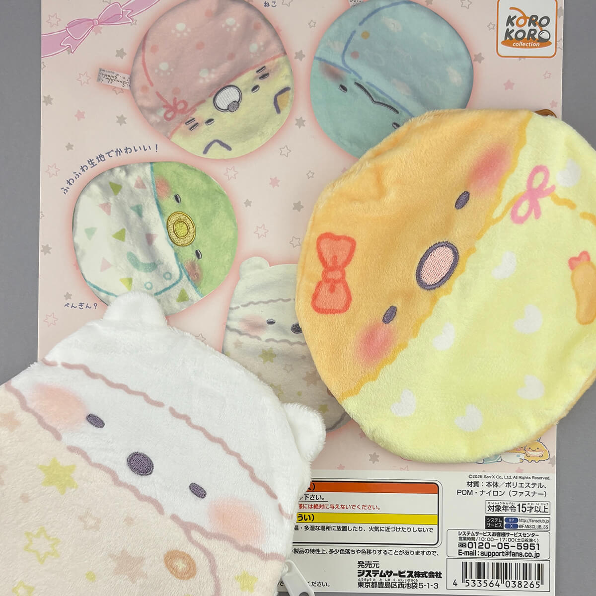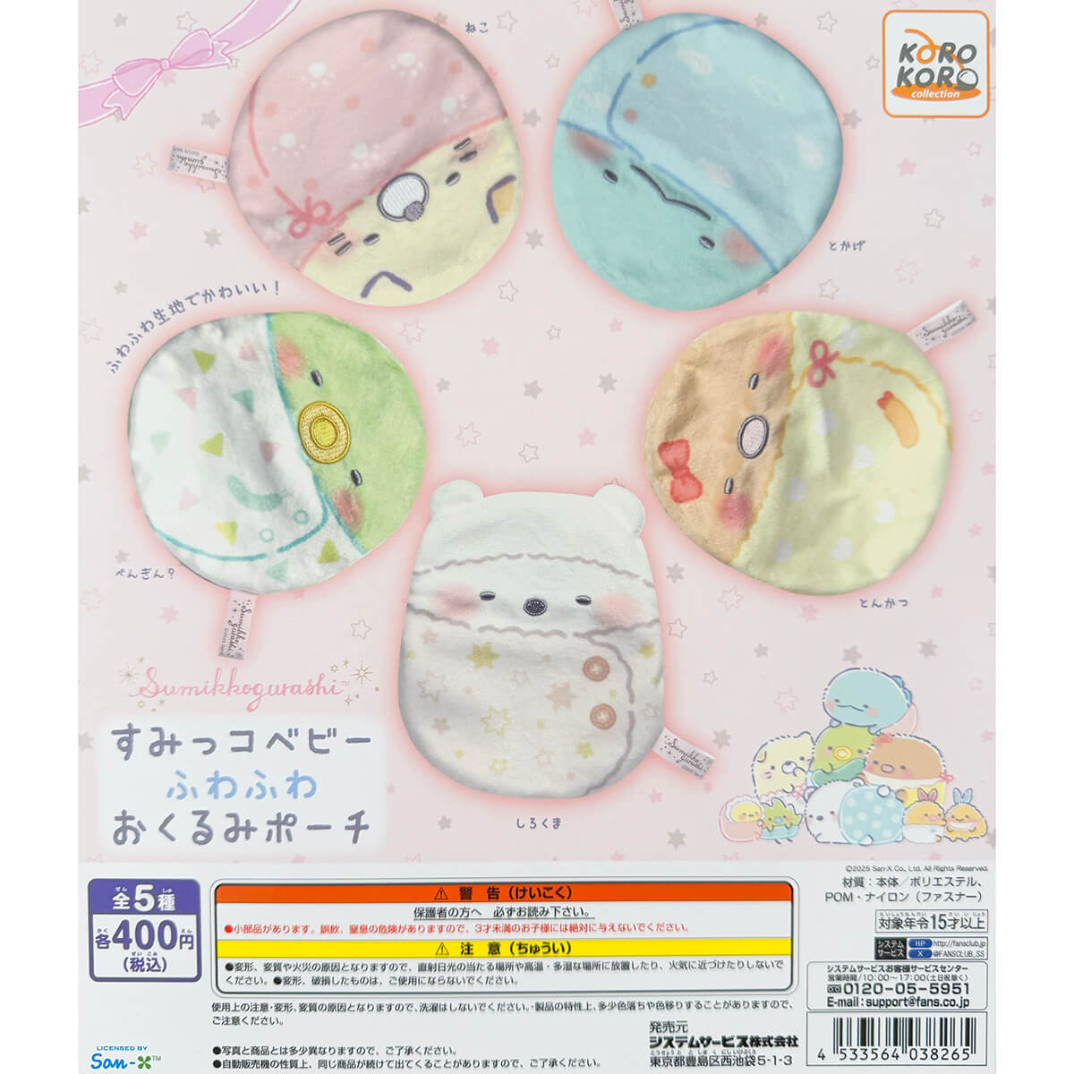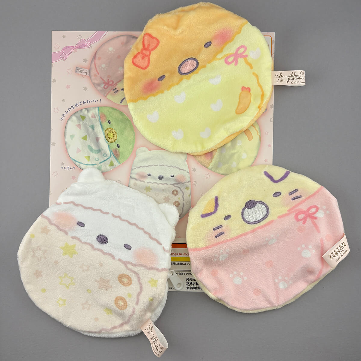 Sumikko Gurashi Baby Fluffy Okurumi Pouch Gachapon Capsule Collectible by Koro Koro. Highly collectible and authentic Japanese gachapon capsule containing one of five different pouches featuring swaddled baby Sumikko Gurashi characters. The pouches are made from a fluffy velour fabric, have emboridered features and a zip fastening.