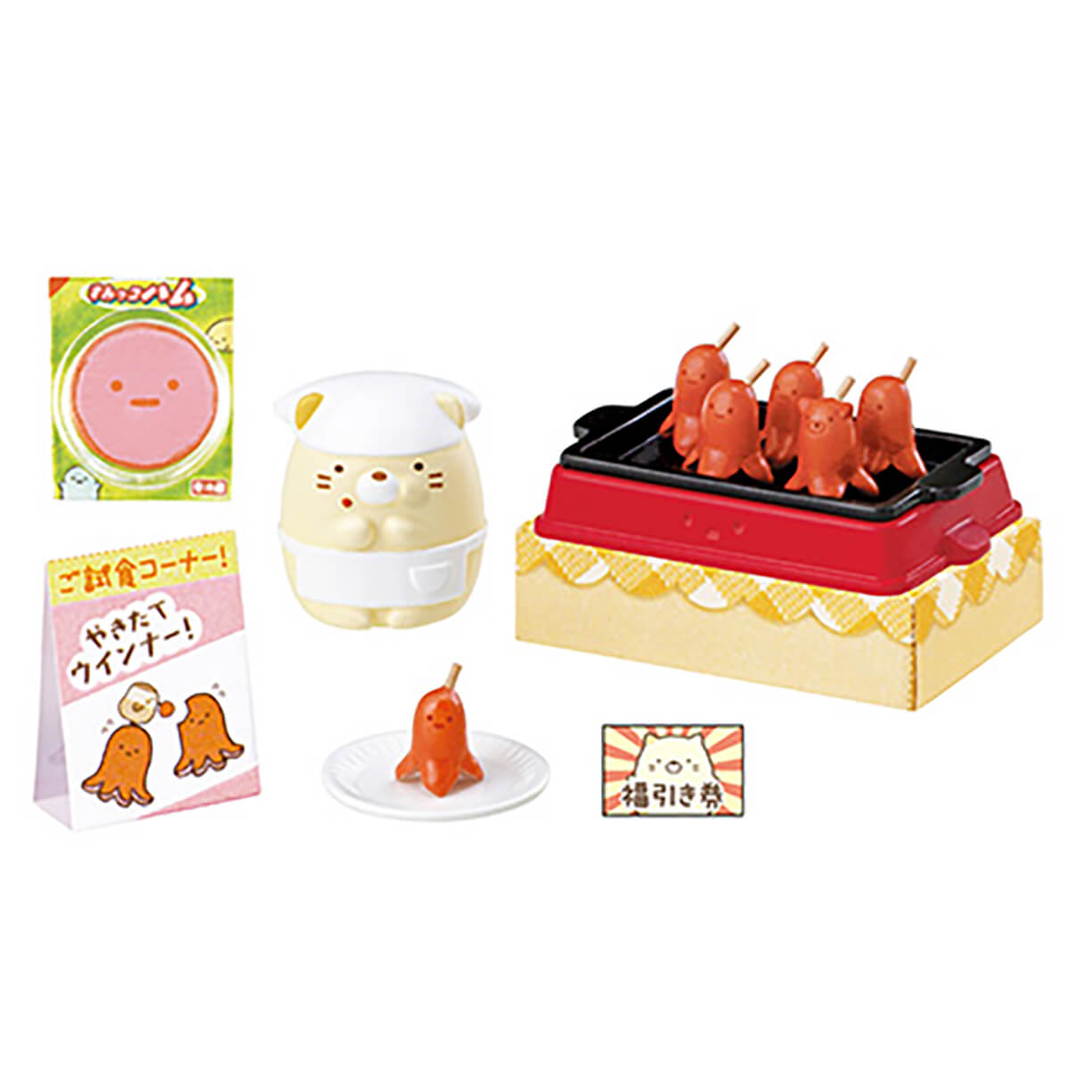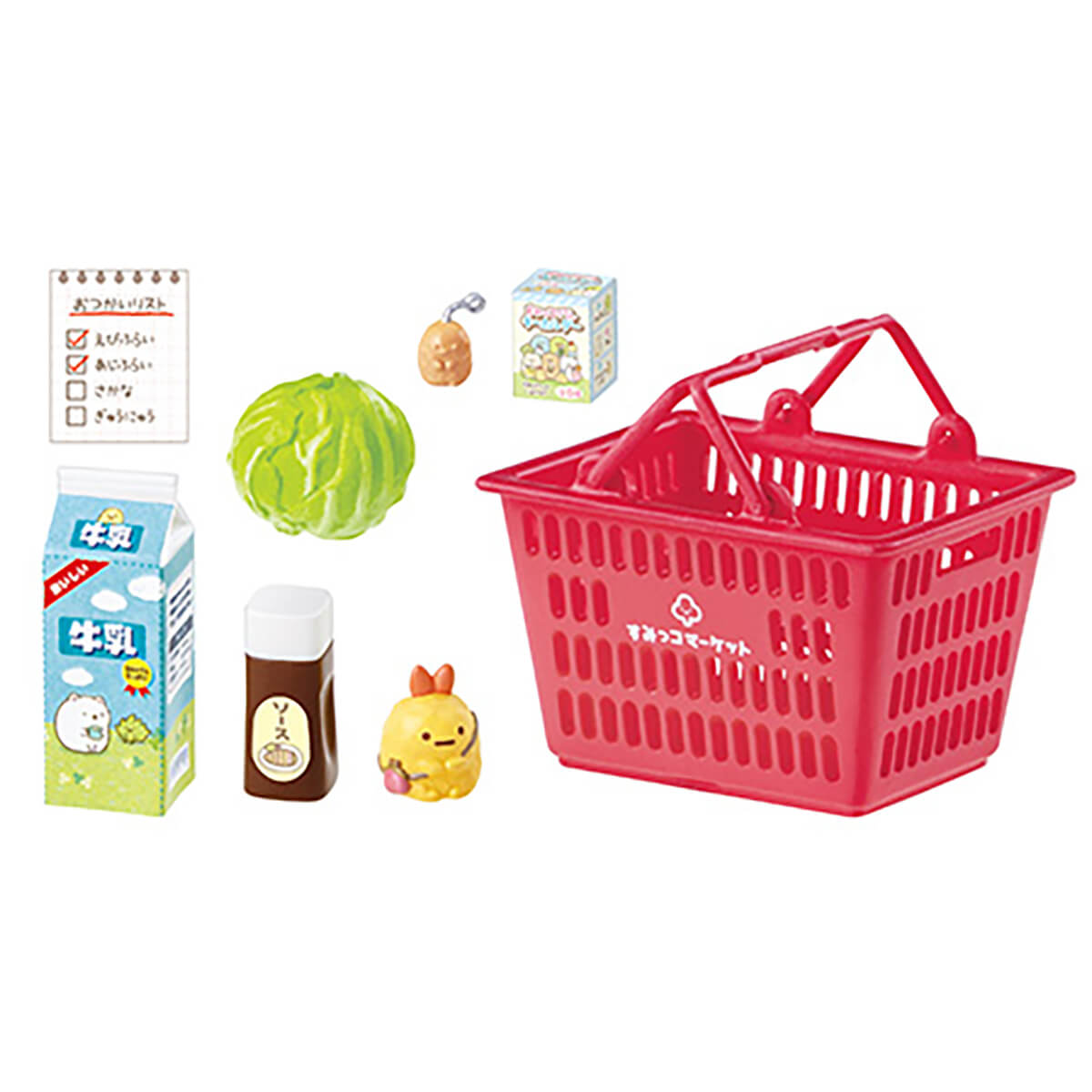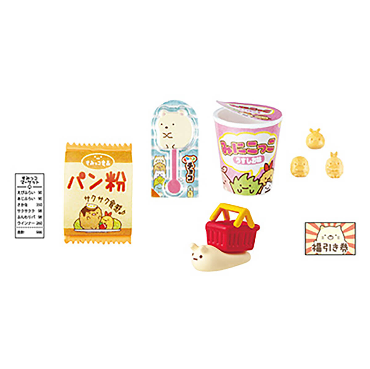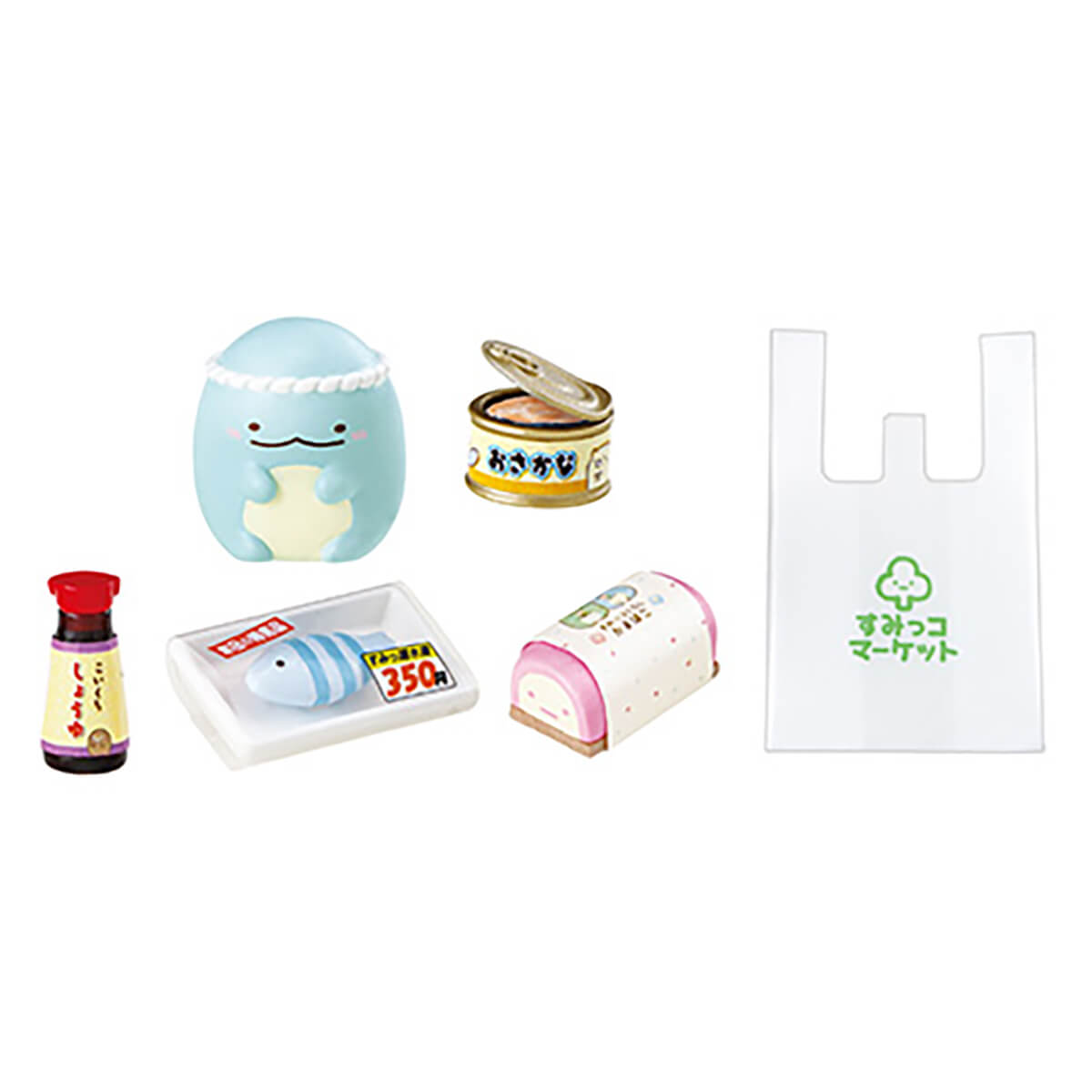 Sumikko Gurashi Supermarket Errand Blind Box by Re-Ment Japan. The Sumikko Gurashi Supermarket Errand series from Rement features miniature supermarket items and groceries all with a Sumikko Gurashi theme to create your own supermarket diorama. Collect all eight for the complete supermarket scene, with shopping basket, cart, food items and mini characters. The miniatures are super detailed: the mini food includes octopus sausages, and the groceries fit inside the shopping basket and cart.
