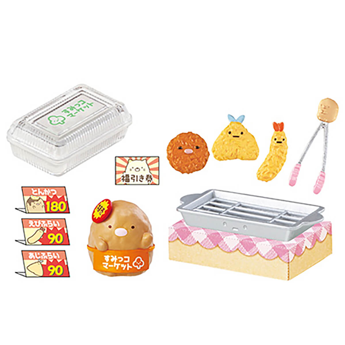 Eight Sumikko Gurashi-themed supermarket scenes / food sets to collect: Shopping Basket, Fried Food, Cucumber, Fish, Flyer, Sausage, Cart and Snacks.