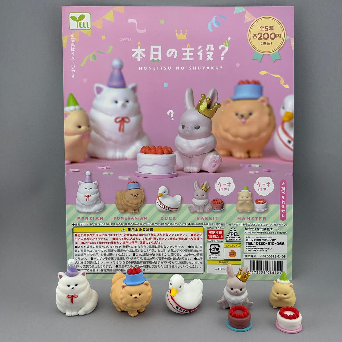 Today's Hero Gachapon Capsule Collectible by Yell Japan. Highly collectible and authentic Japanese gachapon capsule containing one of five animals in birthday celebration outfits with party hats, crowns and cake. The Honjitsu no shuyaku animal figures give the impression of being made to wear the outfits by their owners, their expressions suggesting they do not really understand why! Add some cheer to your workspace or bookshelf with these fun animals. Collect all five animals to create your own mini party!