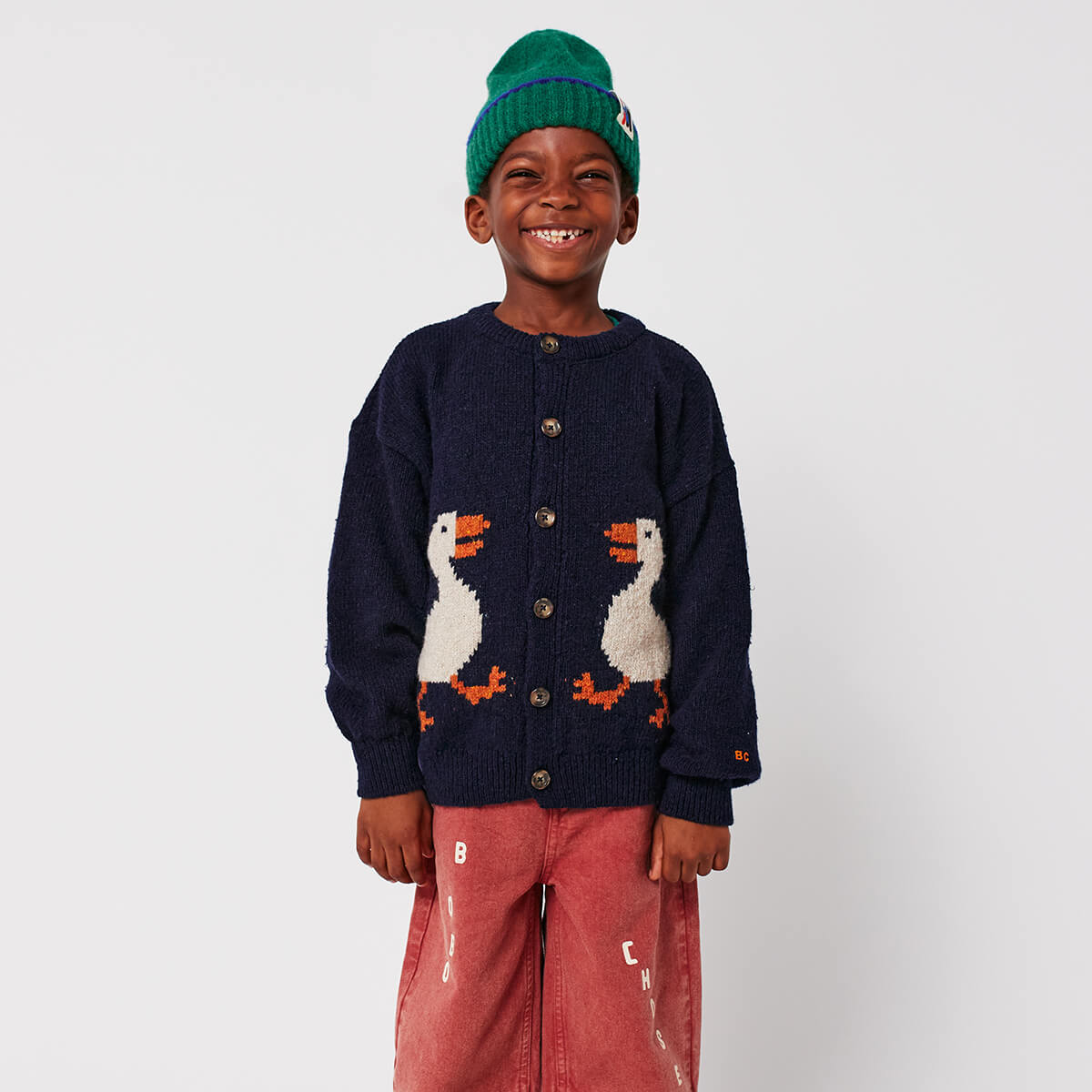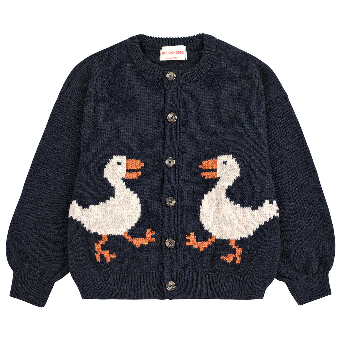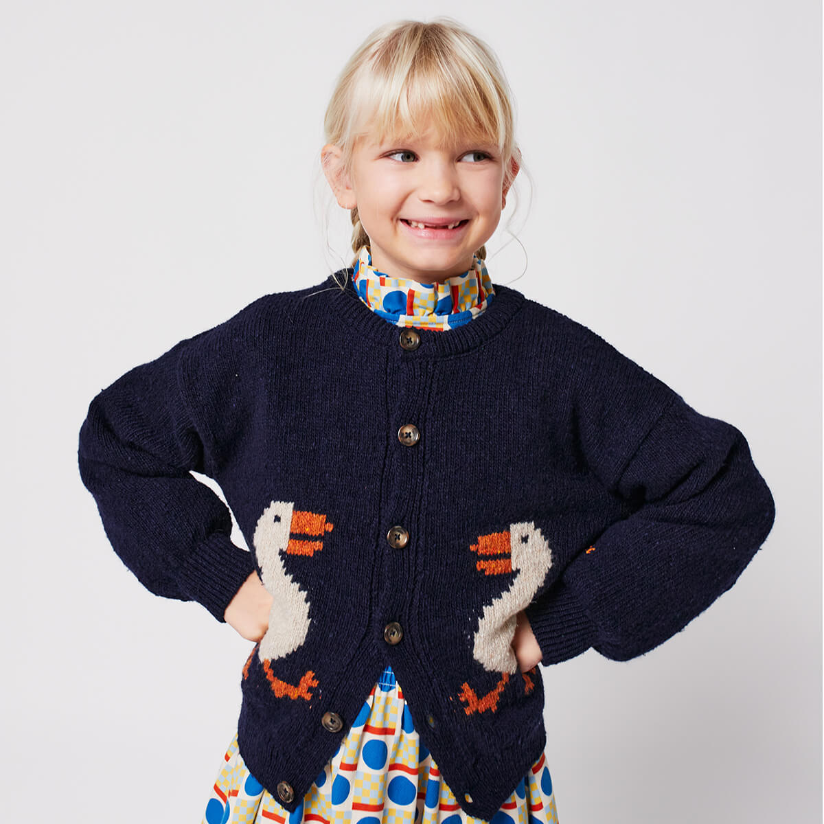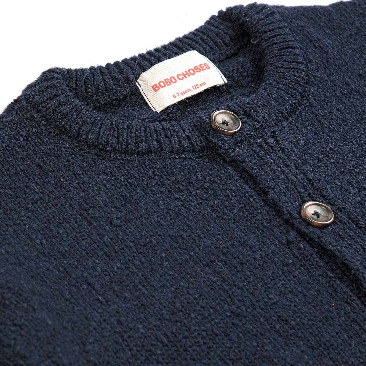 La Oca Jacquard Cardigan by Bobo Choses. A fun and cosy navy blue wool cardigan, designed for those cooler days. This jacquard cardigan features long sleeves, a crew neck, ribbed cuffs and front button fastening.