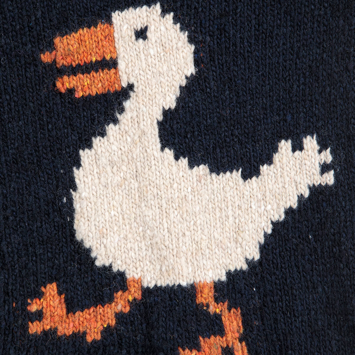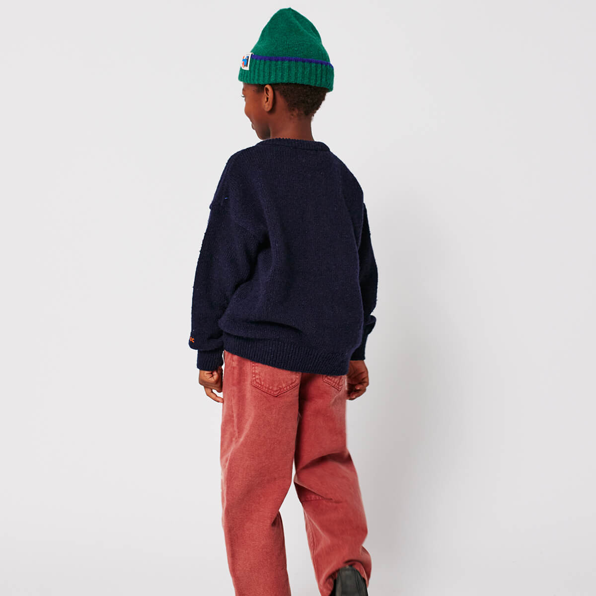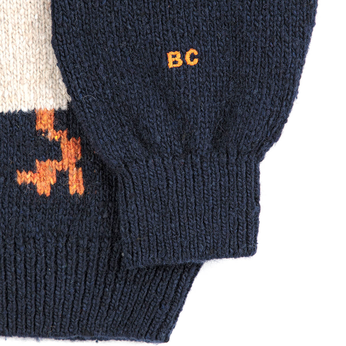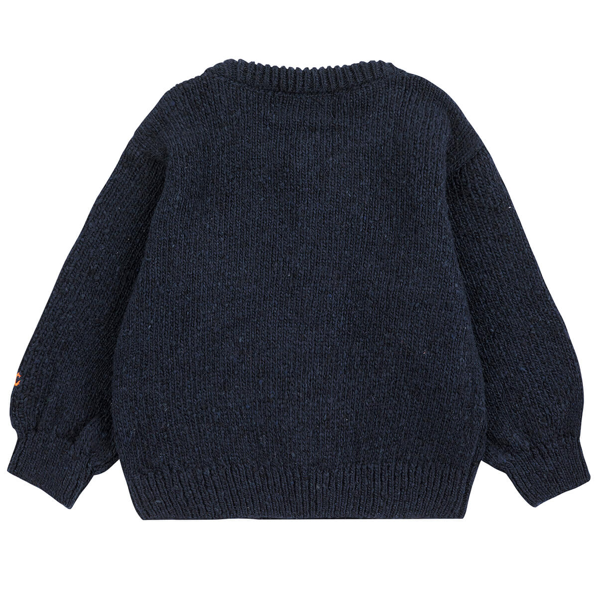 La Oca Jacquard Cardigan by Bobo Choses. A fun and cosy navy blue wool cardigan, designed for those cooler days. This jacquard cardigan features long sleeves, a crew neck, ribbed cuffs and front button fastening.