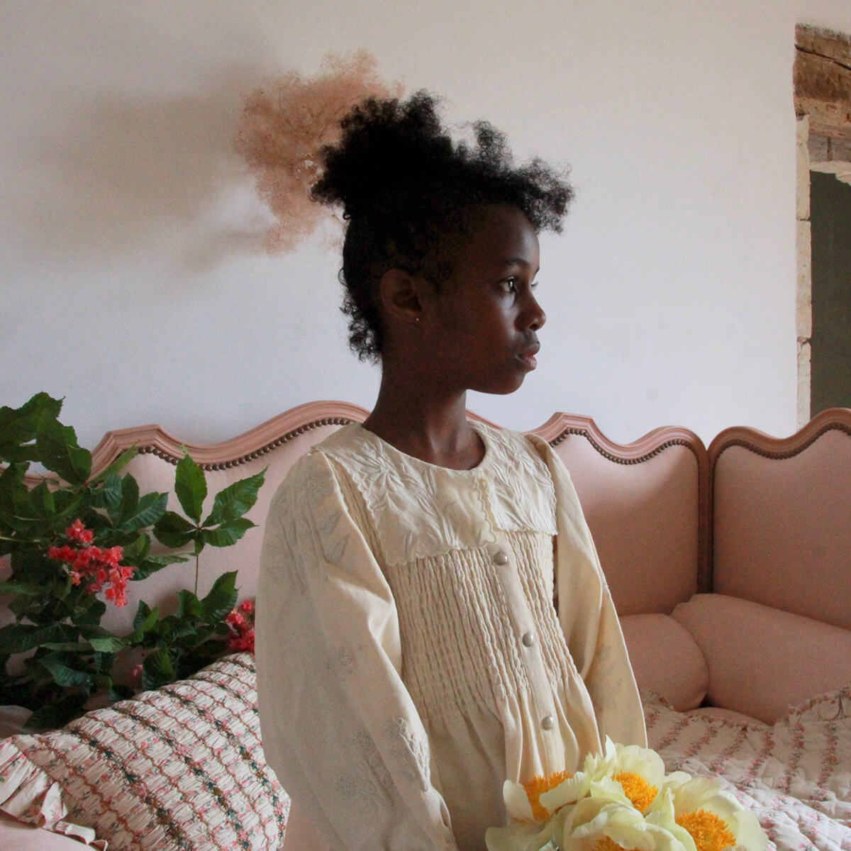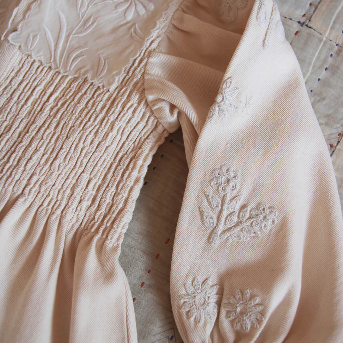 Embroidered Tunique by Bonjour. A heavy denim tunic with Bonjour's statement smocking and large embroidered collar.