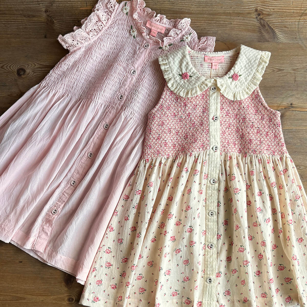 Ibiza Top by Bonjour. This beautiful blouse or dress in lightweight, breezy pink sushi voile has broderie anglaise frill edges on the shoulder. Bonjour's signature smocking on the chest and ivory embroidered flowers adorn the neck.