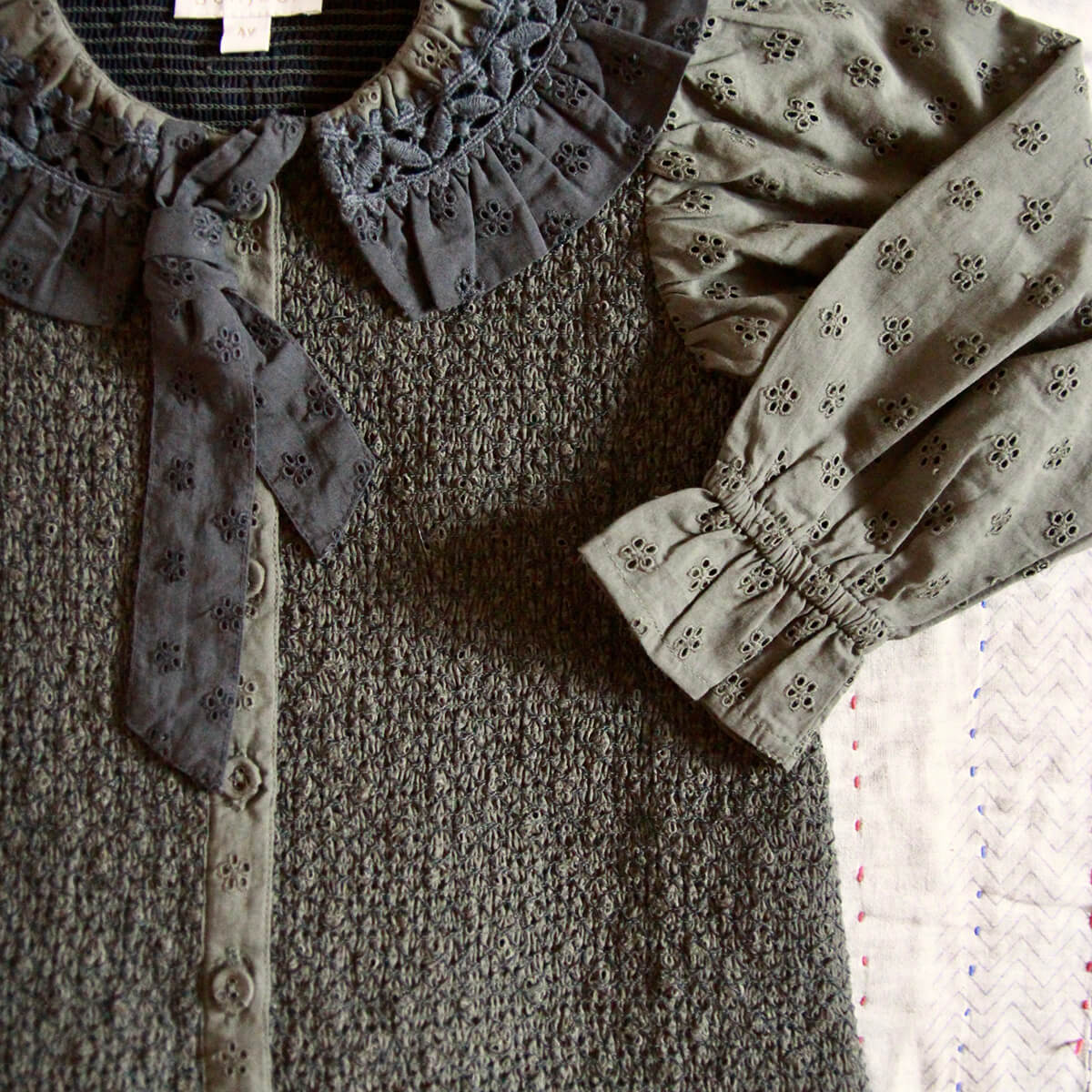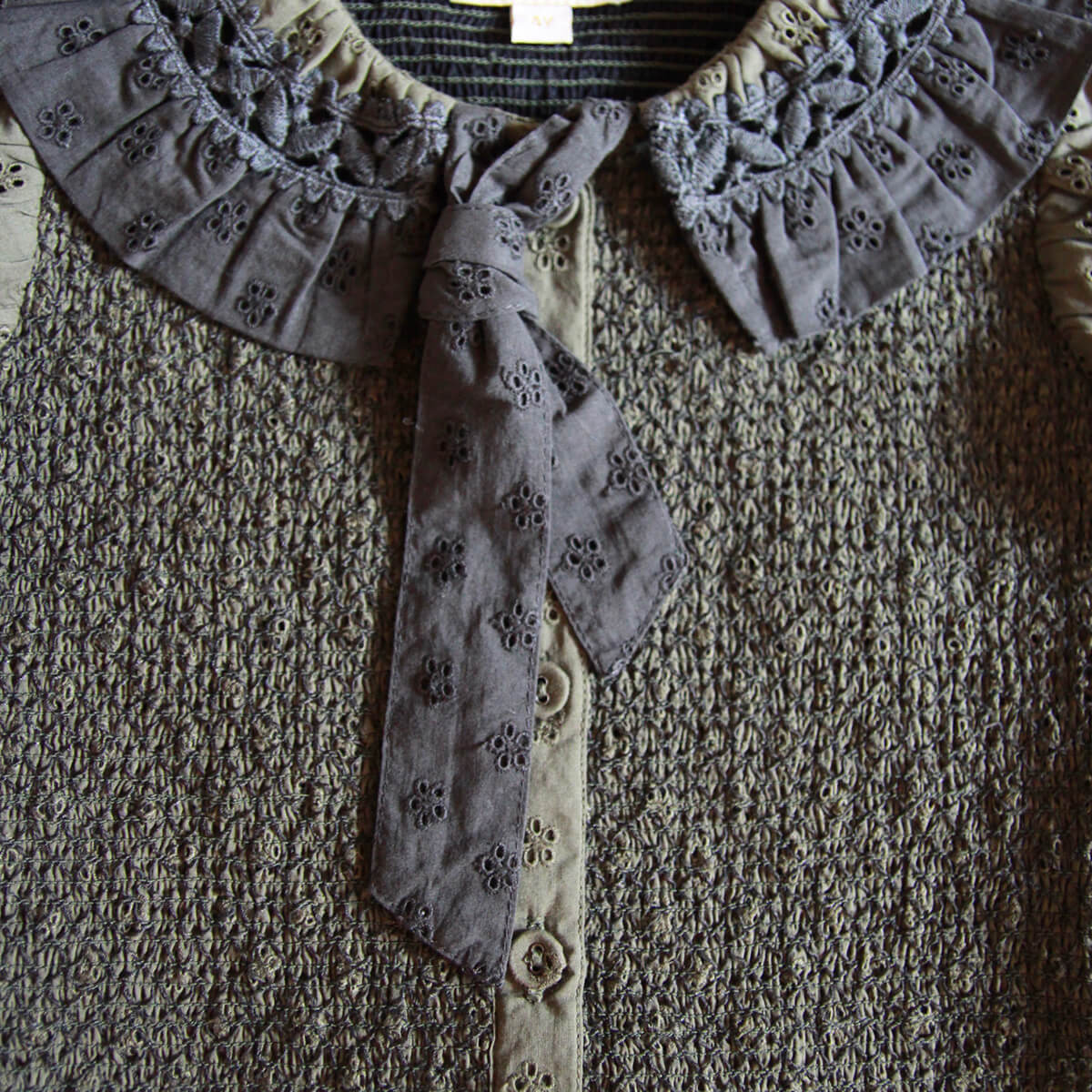 Tie Tunique by Bonjour. A handsmocked broderie anglaise tunic dress with balloon sleeves and flounce collar.