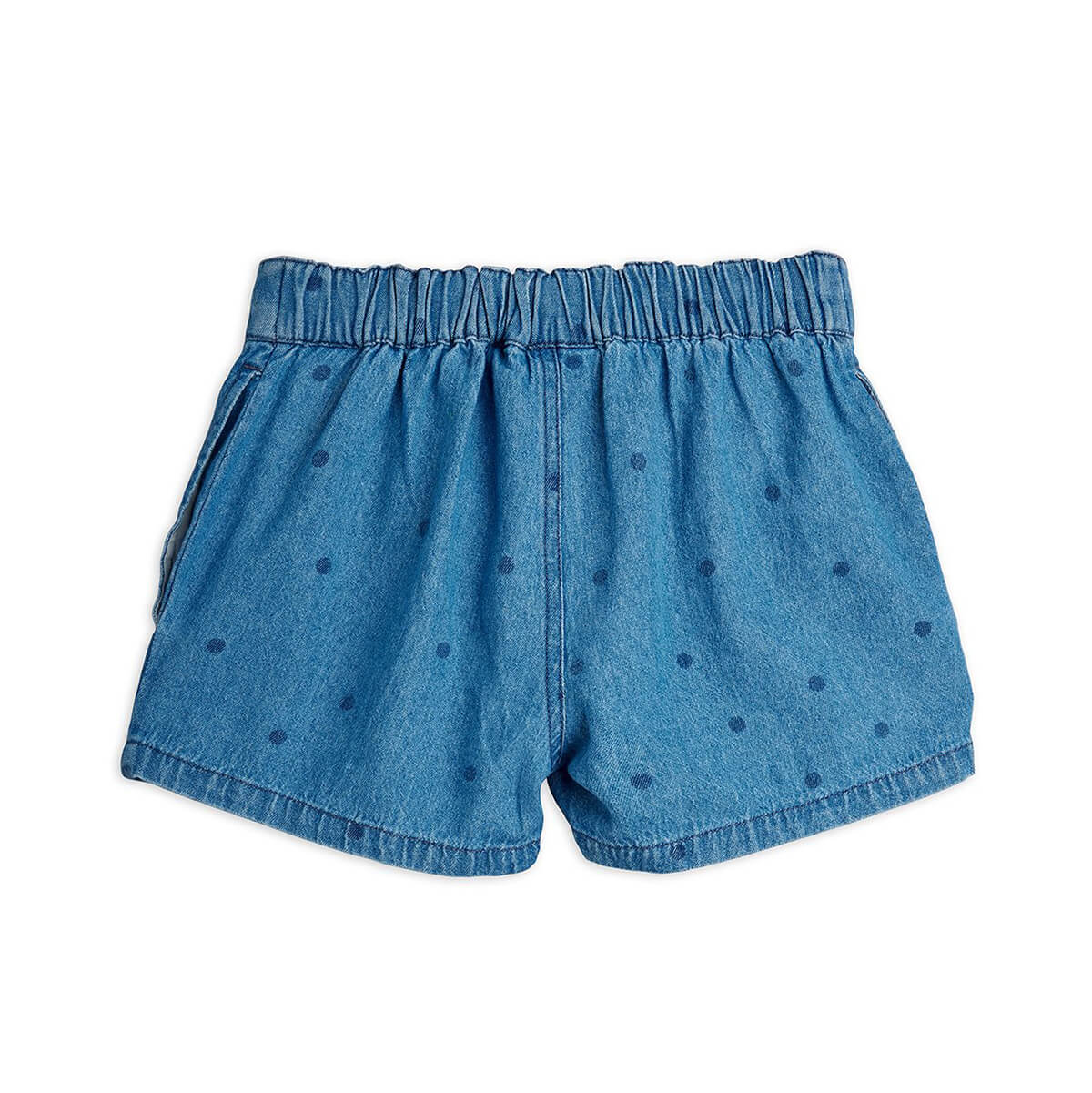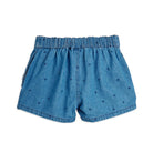 Denim Dots Shorts by Mini Rodini. Lightweight denim shorts with all over dots and an embroidered dachshund motif.