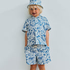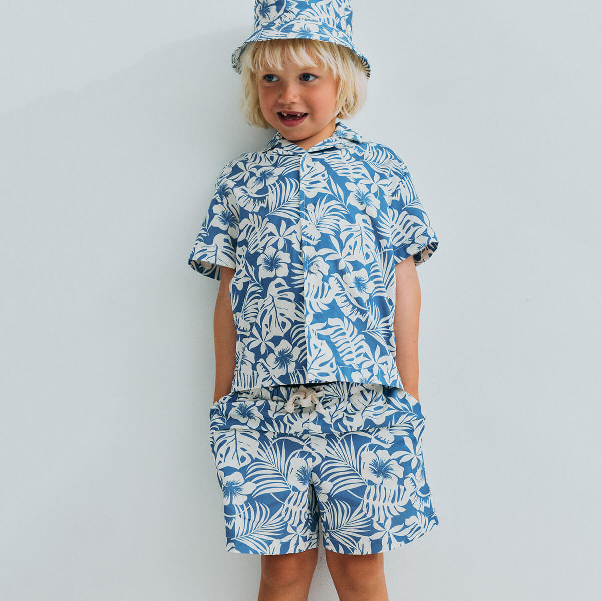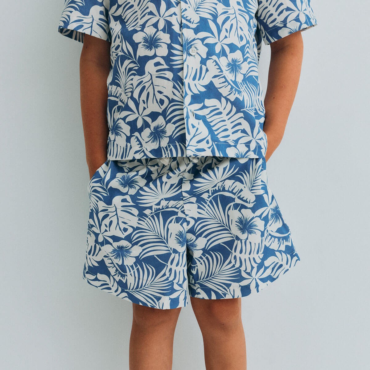 Garden Bermuda Shorts by The New Society. Soft cotton bermuda shorts with a beautiful blue floral print. Features side pockets and an adjustable waistband with a drawstring. Perfect for pairing with the matching shirt.