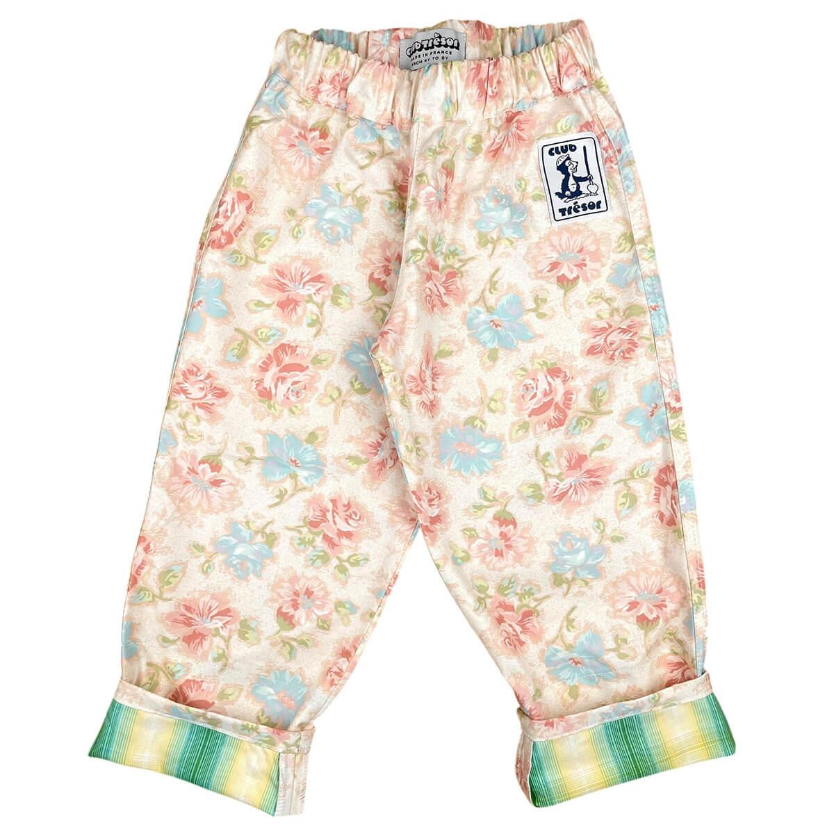 Growing Pants by Club Trésor. The iconic growing pants have been designed to follow the child’s growth for up to two years. Their stretchy elastic waistband adapts to different body shapes and ages. Worn high-waisted for the youngest, they will be worn lower on the waist as your child grows. Its lining on the label allows you to make up to 3 lapels to adapt the length. Made in France, in a workshop in Marseille, using two carefully sources deadstock fabrics dating from the 1970s to the present day.