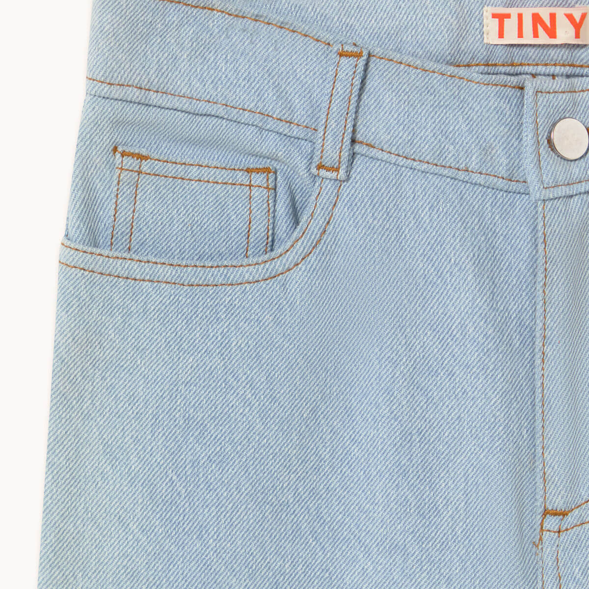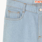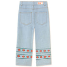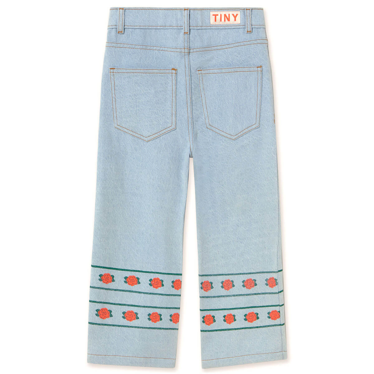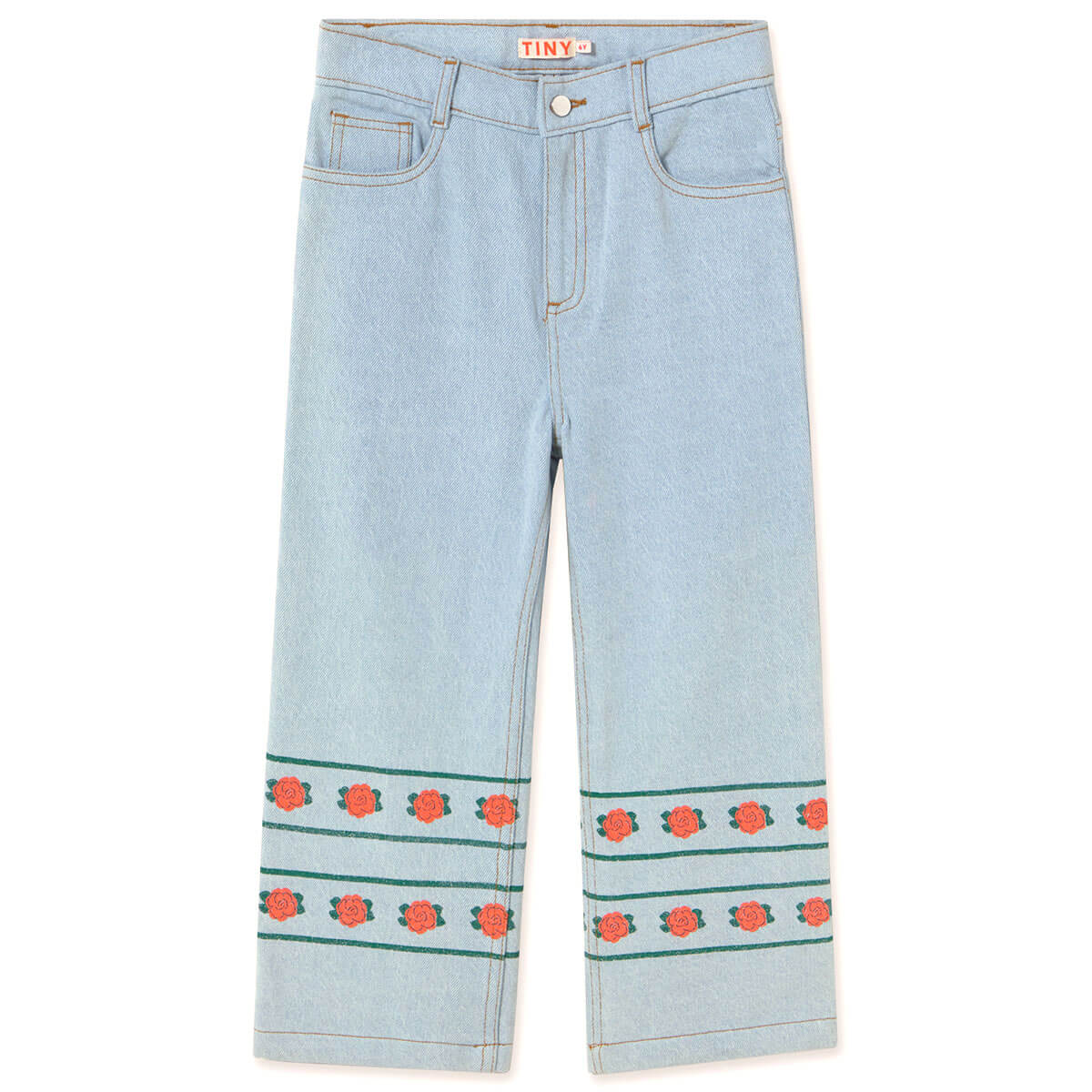 Roses Jeans by Tinycottons. These classic cut denim pants are made from durable 100% cotton fabric. Featuring a straight-leg silhouette, adjustable waistband, and snap button closure, they offer a comfortable and practical fit. Contrasting stitching adds a fresh, distinctive touch, while the roses print on the lower part provides a delicate and charming detail.