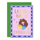 Little Baby Cheesus greetings card by Ickaprint. The ultimate cheese lover's Christmas card. Gold foiled Christmas greetings card in an Exclusive Ickaprint design. Blank inside.