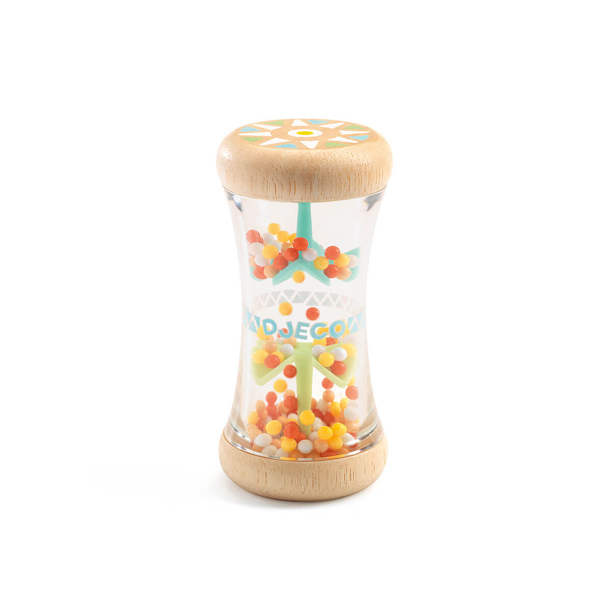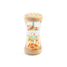 BabyPlui Rain Shaker by Djeco. A small rain stick made of natural wood and pastel colors, designed for babies from 3 months old. Baby can turn and shake the stick to see the beads fall and listen to the gentle sound of rain.