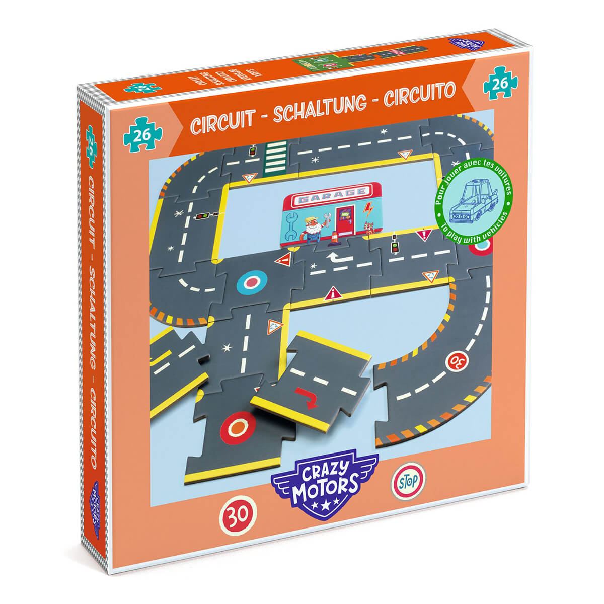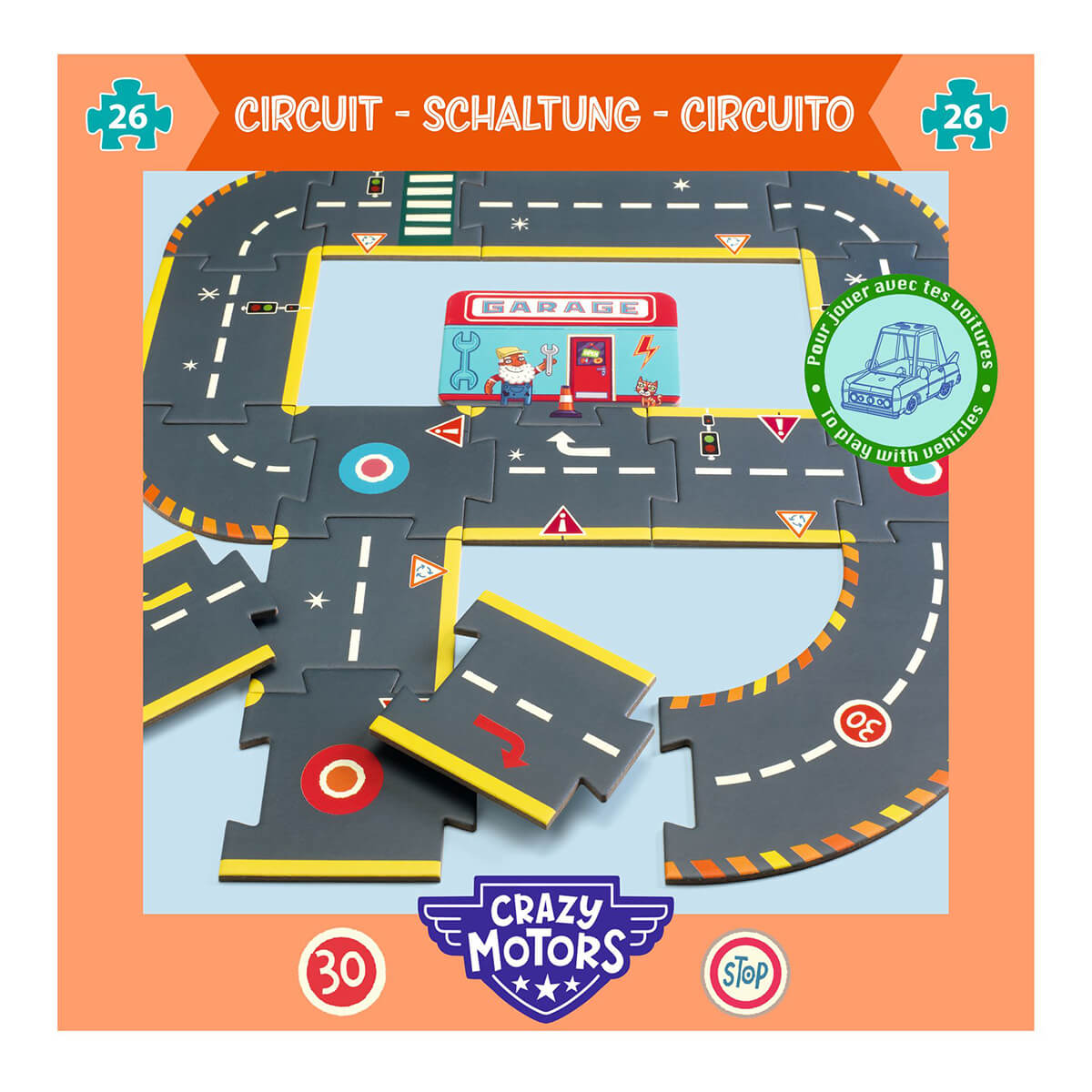 Crazy Motors Puzzle Circuit by Djeco. A giant racetrack for thrilling adventures with Crazy Motors cars! With its 26 modular pieces, this track offers endless possibilities for creating unique courses. Children can imagine, assemble, and personalize their tracks for exciting races. Ready to hit the road? This set promises hours of fun and creativity for all little car enthusiasts!
