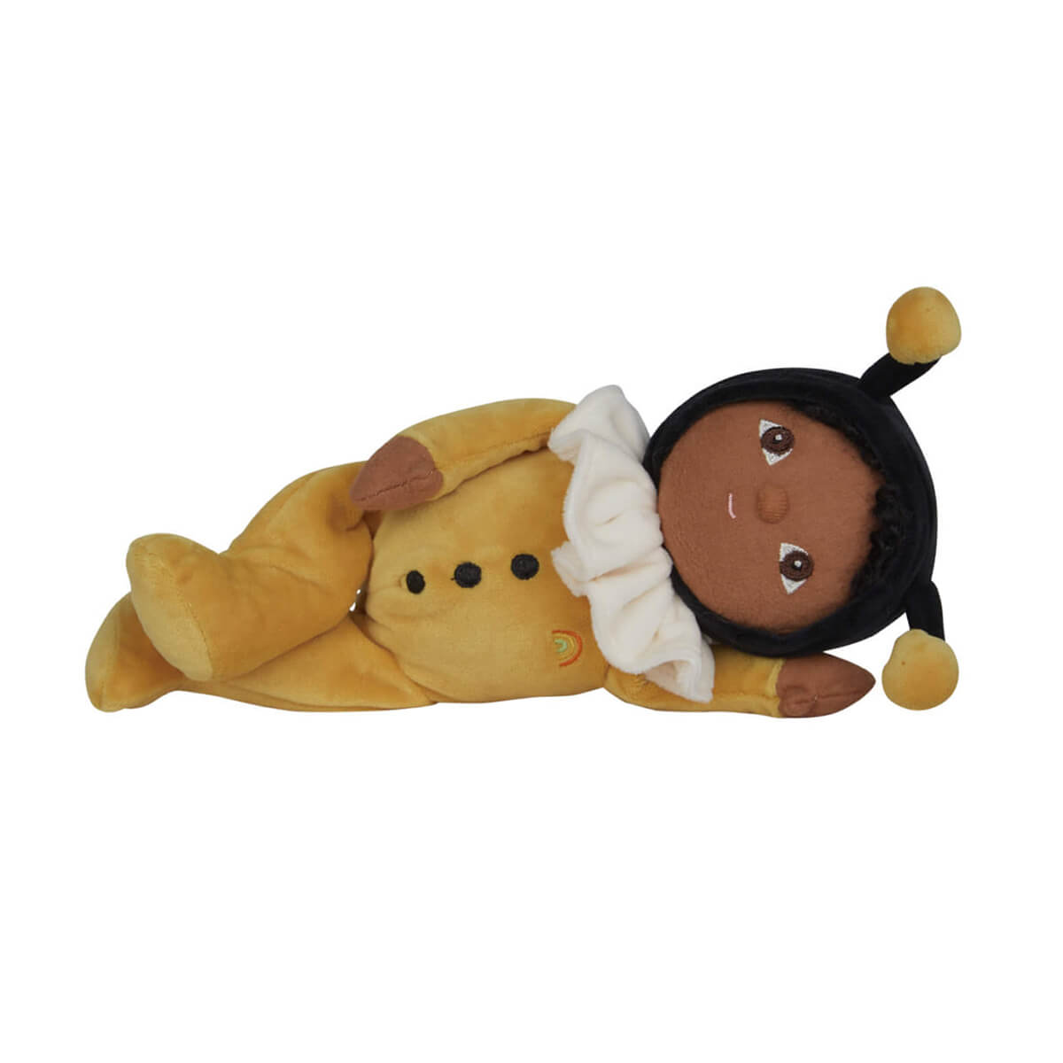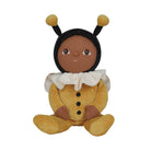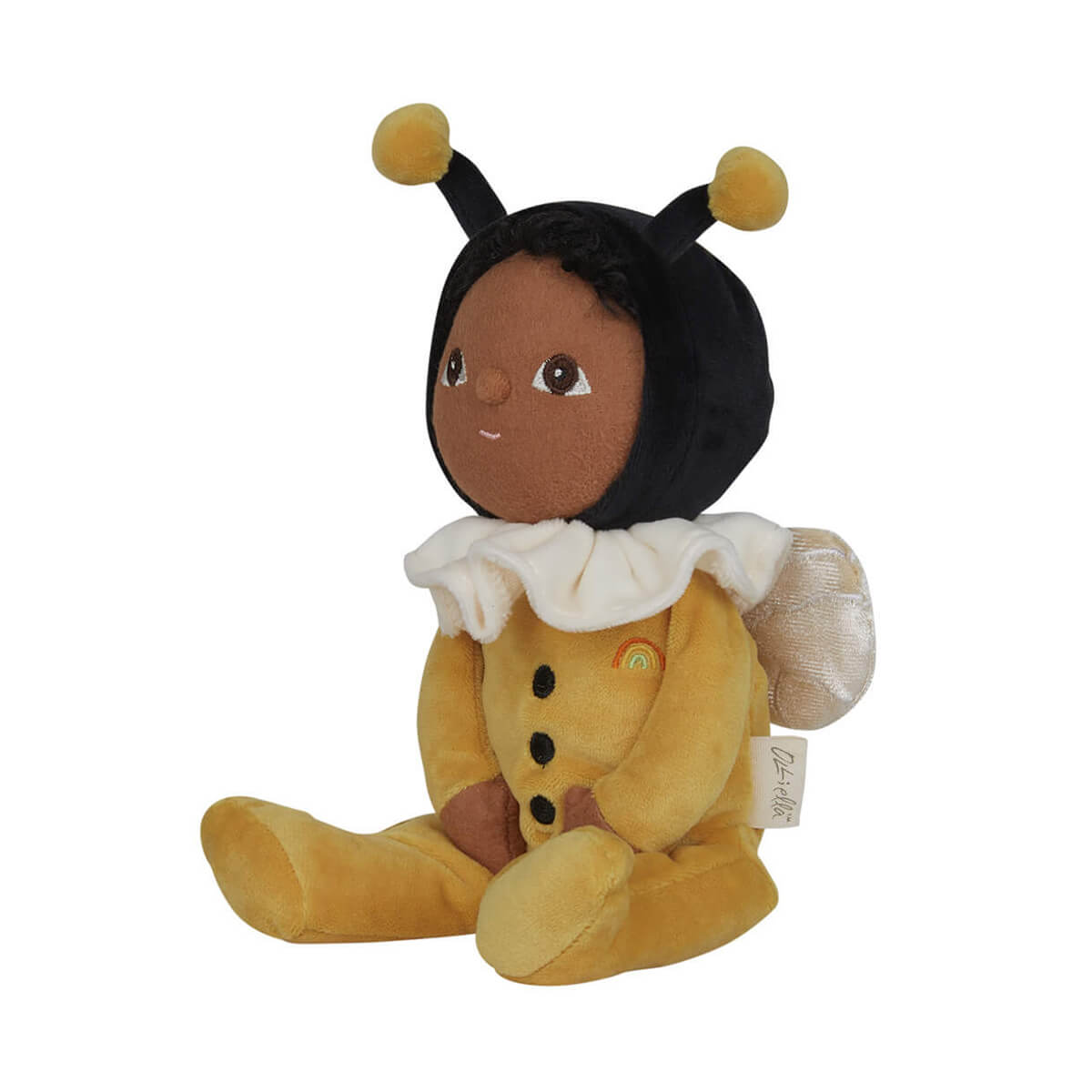 Billie Bumblebee Dinky Dinkum by Olli Ella. Billie Bumblebee is the ultimate collector of stories, pollen, and the occasional snack crumbs. Always buzzing from one adventure to the next, Billie is as curious as she is cheerful, flitting about with a purpose and a smile. The one who knows all the best spots to find a good story and a sweet treat, never missing a beat (or a snack). Billie Bumblebee’s golden-yellow velvet suit and white frilly collar look as charming as a spring garden, with shimmering champagne wings that capture the light. Dressed in a black hood and antennae, with yellow detailing at the top, to complete the playful look. With a beautiful brown skin tone, brown eyes, and a heart full of joy, Billie is always ready to lend an ear for a good story, or a buzz of advice.