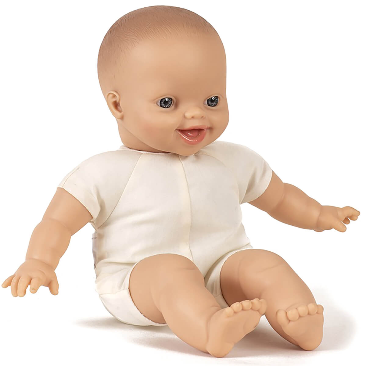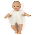 Liv baby doll with soft fabric body by Minikane X Paola Reina. Soft bodied doll for cuddling with a skin-coloured cotton body. Blue eyes.