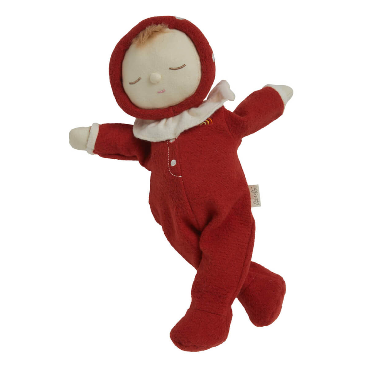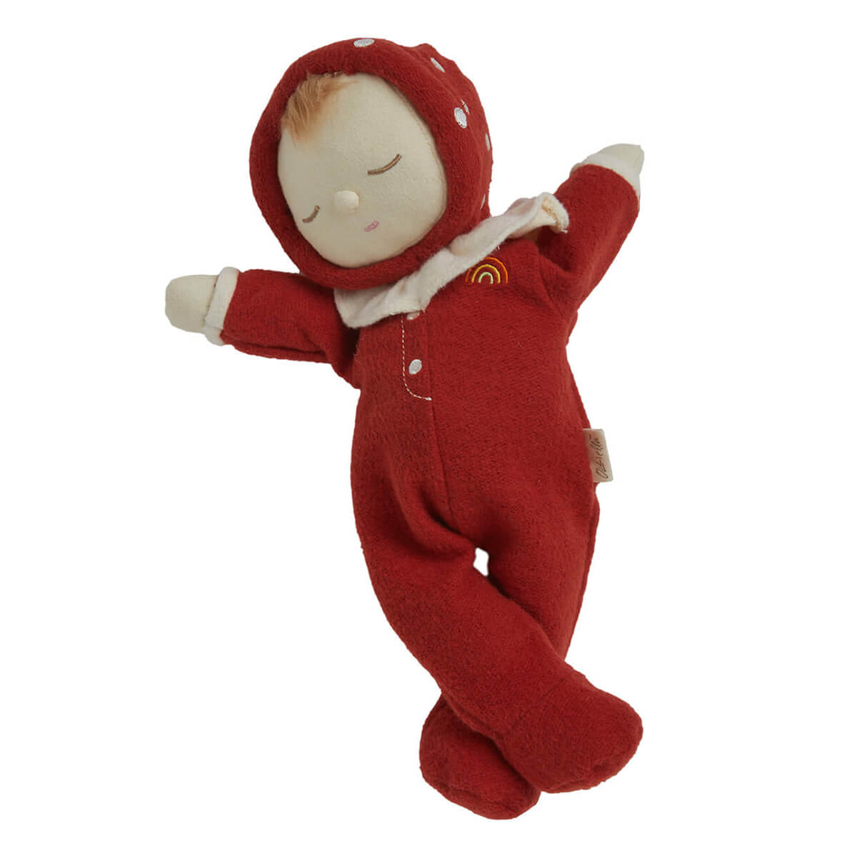 Moppet Toadstool Dozy Dinkums Doll by Olli Ella. Rosy red and ready to snuggle, Moppet brings a sprinkle of forest magic to every cuddle. With a mushroom-cap hood complete with embroidered spots, a frilly collar, and the softest cottony suit, this Dozy Dinkum is made for dreaming.