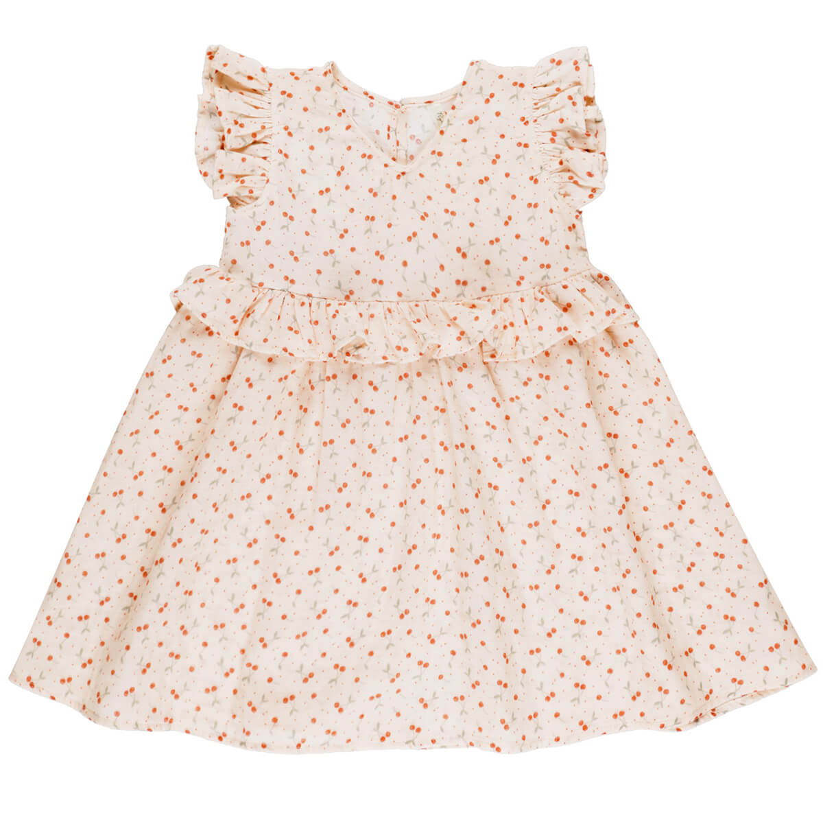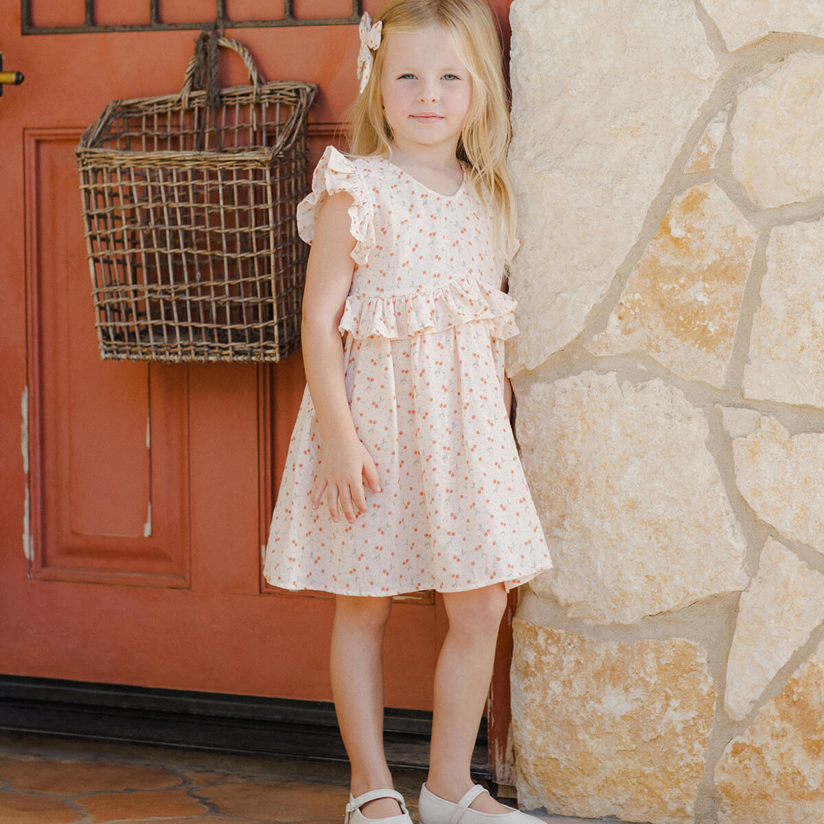 Brielle dress by Rylee & Cru. A flowy dress with a v neck and ruffle detail at the sleeves and waist. Featuring a cherries print on natural hue.