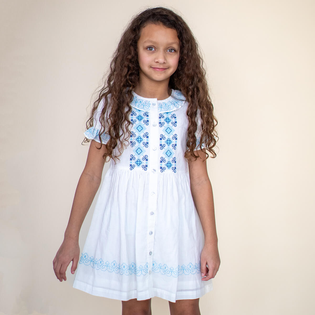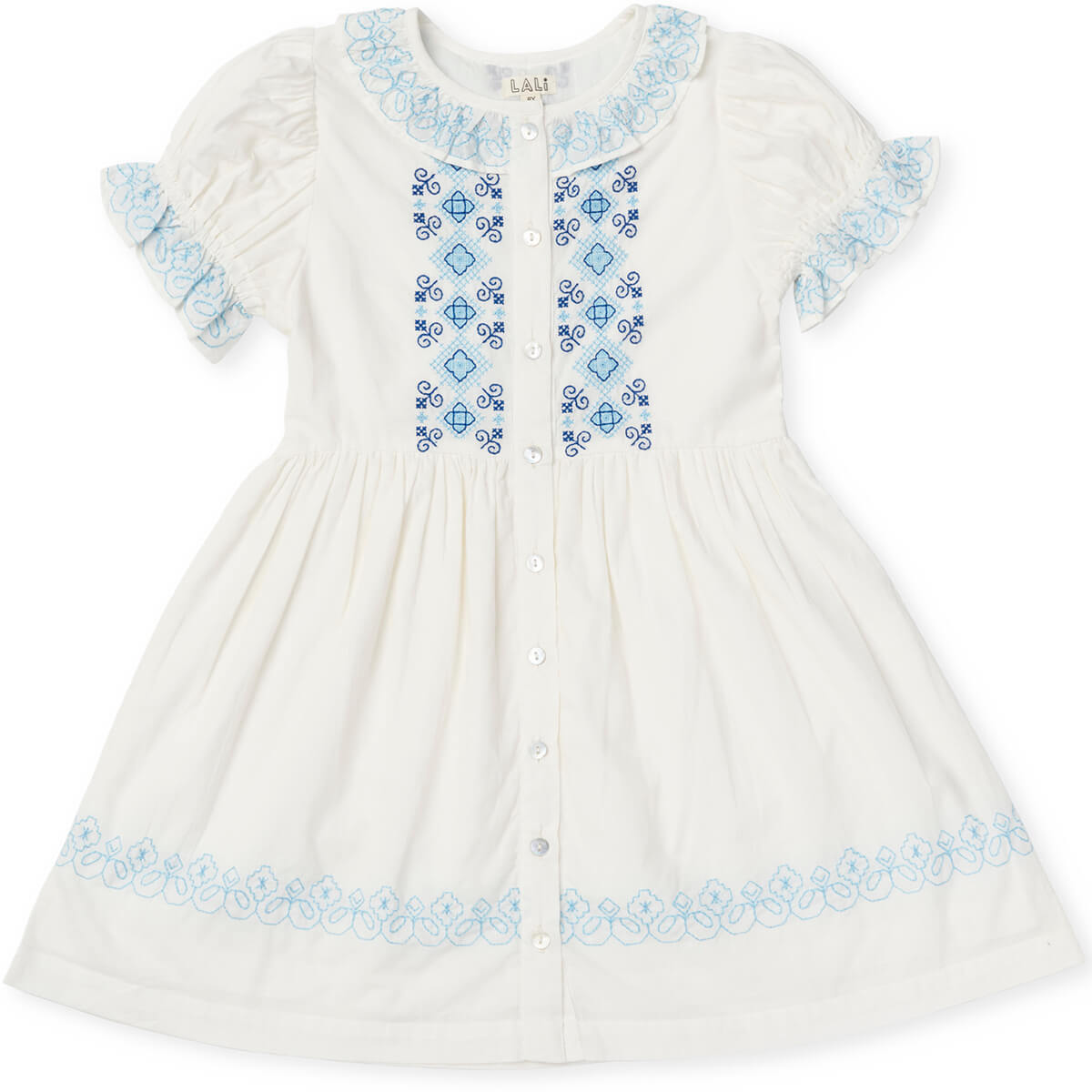 Ivy Dress by Lali. The Ivy Dress in Opaline Embroidery is a charming Lali favorite. Ivy features a relaxed puffy short sleeve, a sweet neckline ruffle, smocking at the bodice and a skirt designed to fall just below the knee. Two embroidery panels adorn the bodice at either side of the mother-of-pearl button panel. The Ivy Dress in Opaline Embroidery is made from 100% cotton and fully lined. She has side seam pockets, perfect for collecting warm-weather keepsakes.