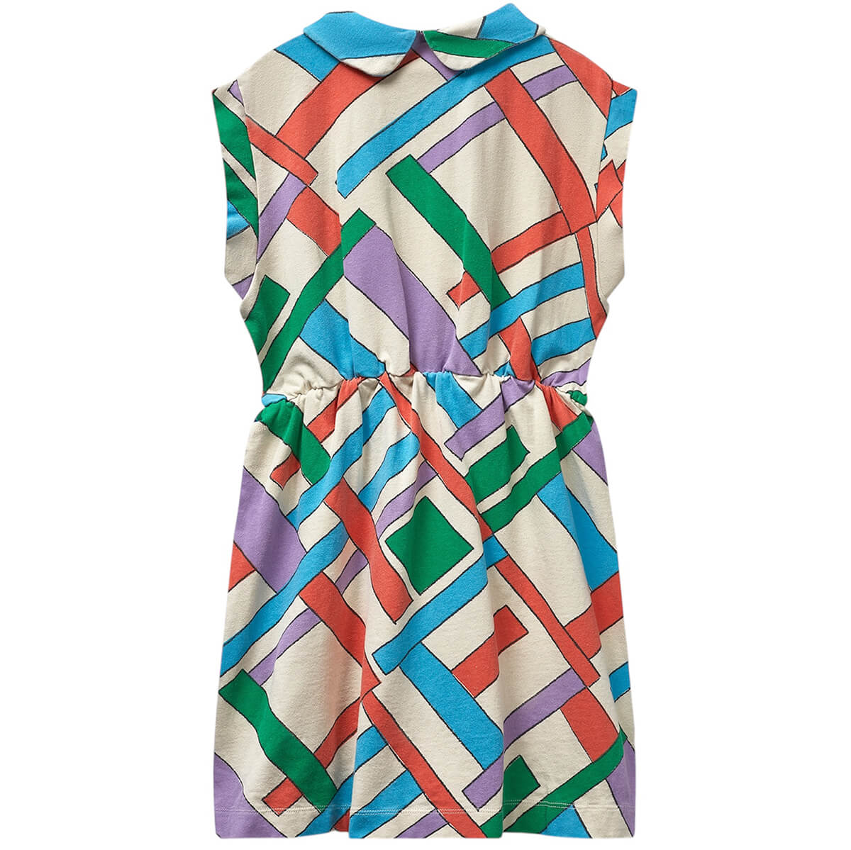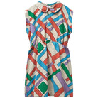 Sleeveless Cloud Dress by Wynken. This sleeveless blouson-style dress with an elasticated waist combines comfort and style with a full, twirl-worthy skirt. The delightful Peter Pan collar adds a sweet, timeless touch, while the front placket with snap openings ensures easy dressing. Crafted from soft double jersey fabric, it features an all-over kite block print that’s perfect for playful days. Finished with the embroidered Wynk logo on the chest, this dress is a whimsical and comfortable choice for any occasion!