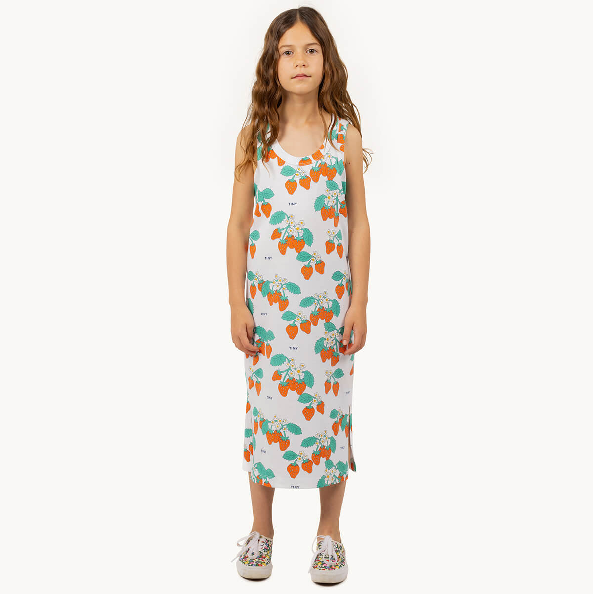 Strawberries Dress by Tinycottons. A longer length sleeveless cotton dress with an all over strawberry print.