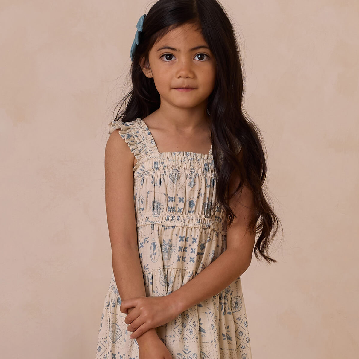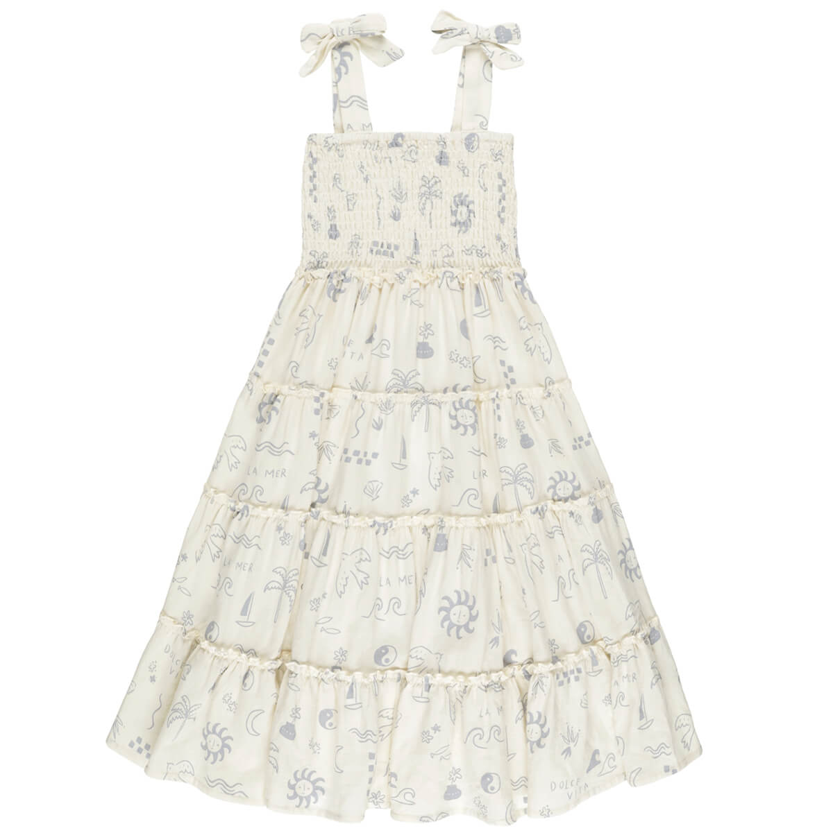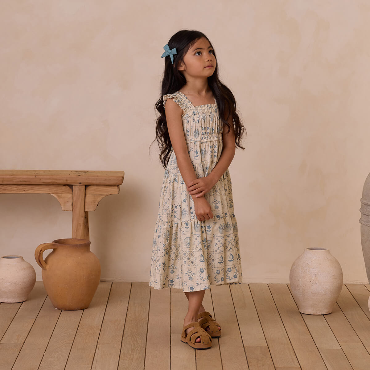 Taylor dress by Rylee & Cru. Four tiers with ruffled seams, a smocked bodice, and fixed bow straps come together to make this delightful dress. Live la dolce vita in this breezy Mediterranean print.