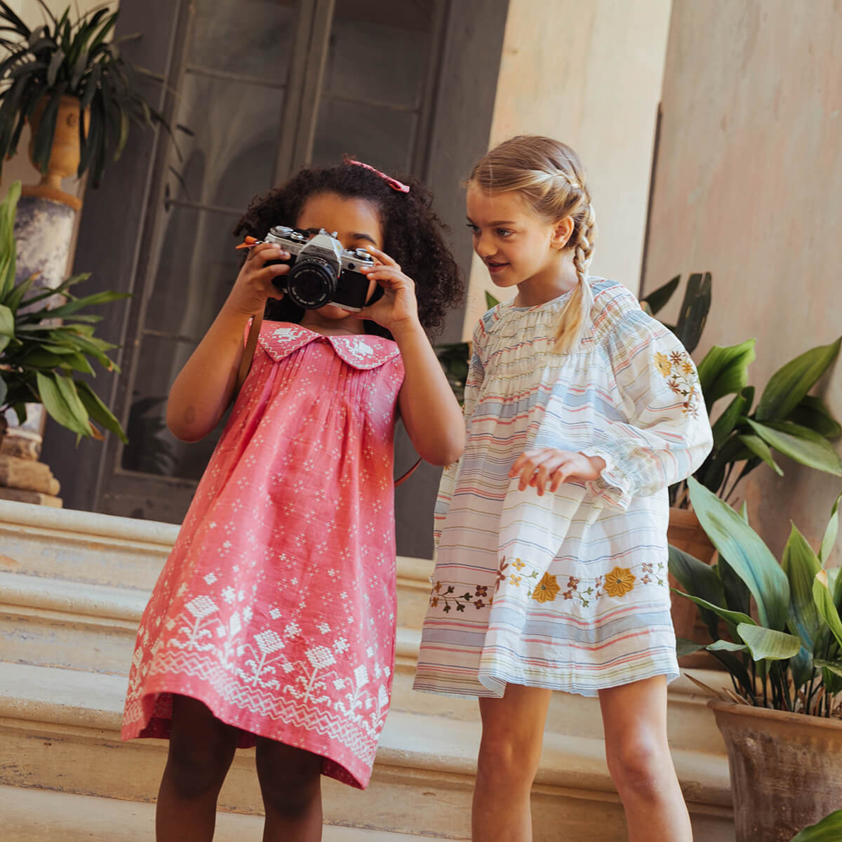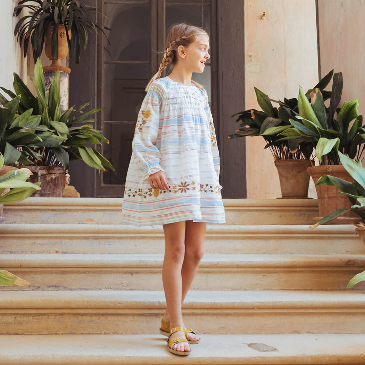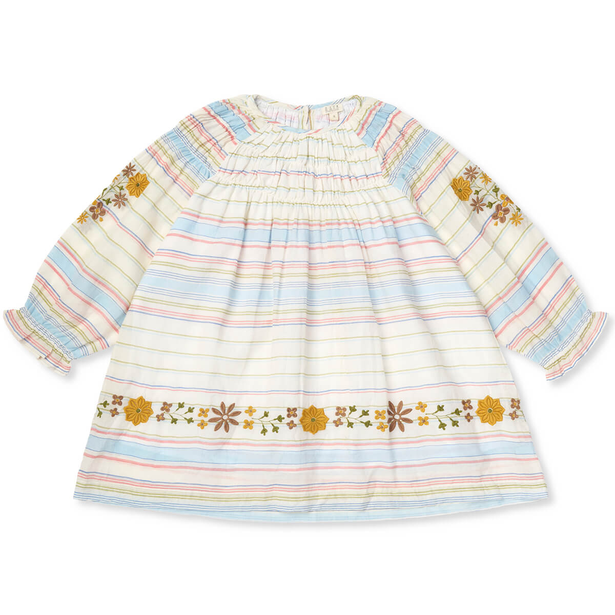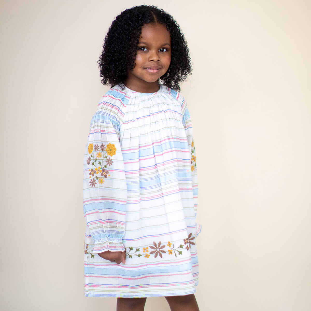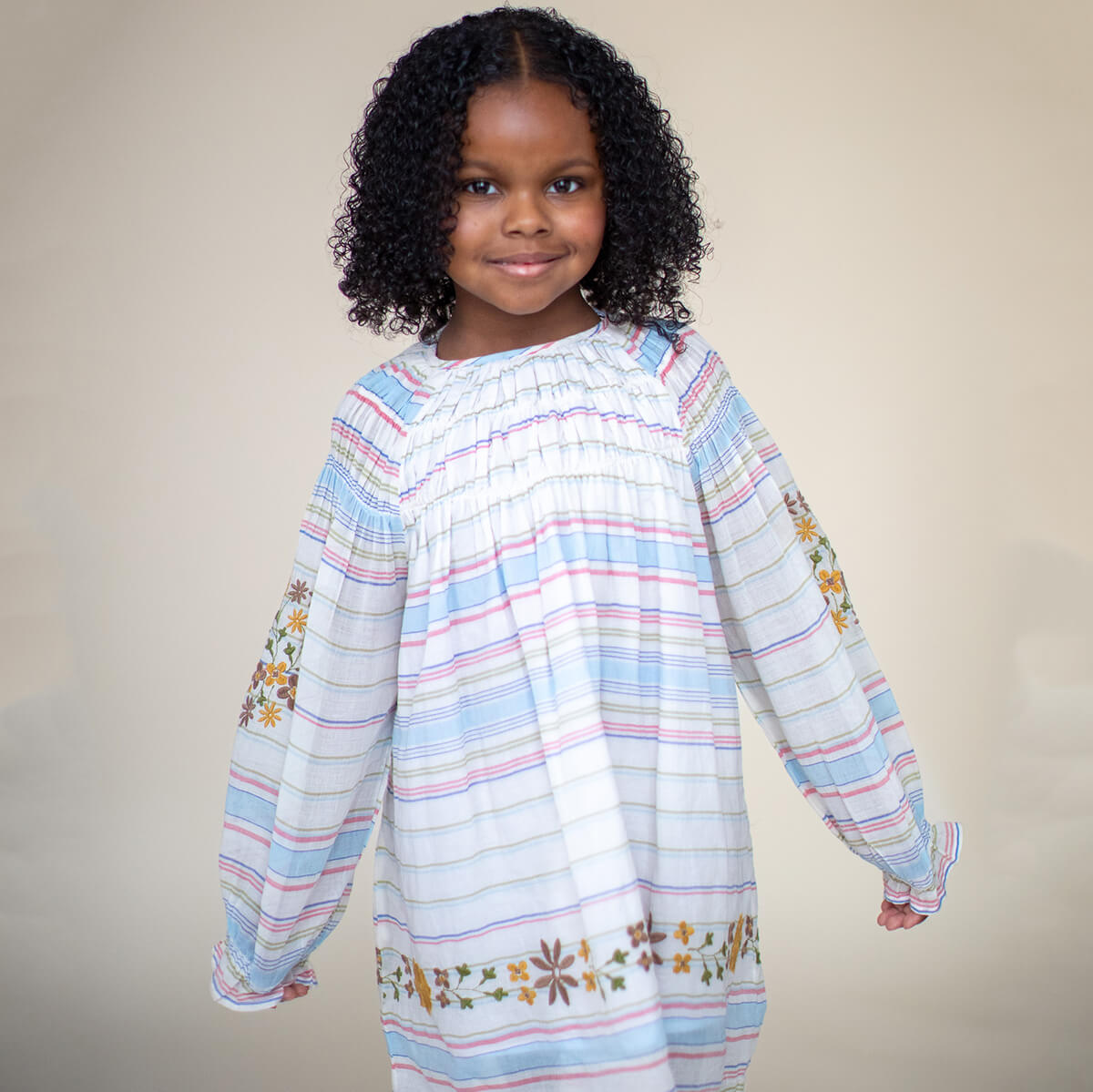Tulip Dress by Lali. Perfect for all occasions, the Tulip Dress in Border Stripe is a staple in every Lali wardrobe. Our favorite silhouette in this Spring’s border stripe is made of 100% cotton and fully lined. Gentle elastic at each long sleeve creates a sweet ruffle at each wrist. Gathering at the neckline adds extra detail. The Tulip also includes floral embroidery at the hem of the dress and sleeves, as well as a mother of pearl button closure at the back.