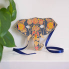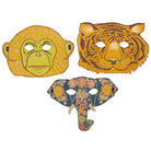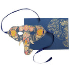 Elephant mask greetings card by East End Press. Hand printed greetings card printed and cut in the shape of an Elephant's face. The card is made from thick recycled paper with pre-cut eye holes, and ribbon either side so the greeting card can be used as a mask. Printed on the front with a blank reverse for the sender's message. The card comes complete with a hand printed coloured envelope with an elephant motif, to create a truly luxurious and special card.