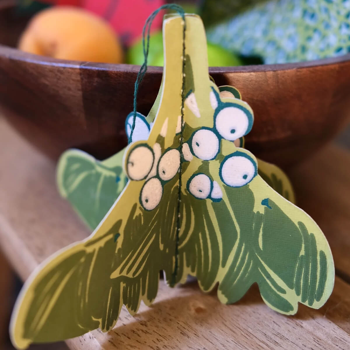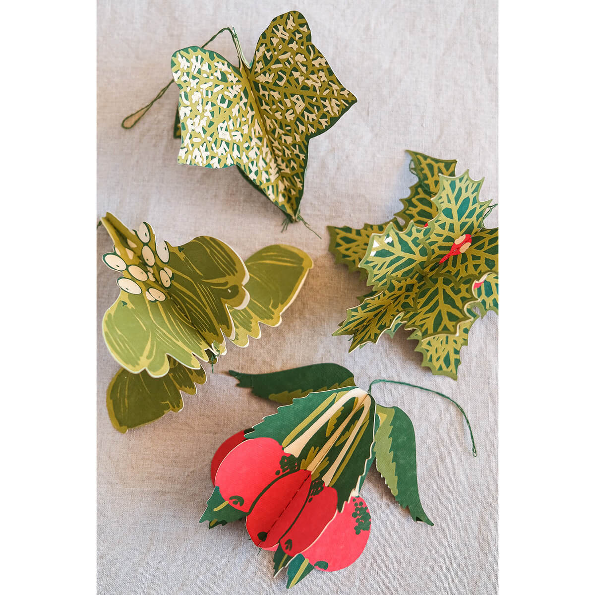 Festive foliage paper ornaments by East End Press. A set of 4 illustrated paper decorations with cotton 10cm hanging loop. Featuring ivy, holly, mistletoe and red berries.