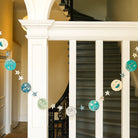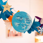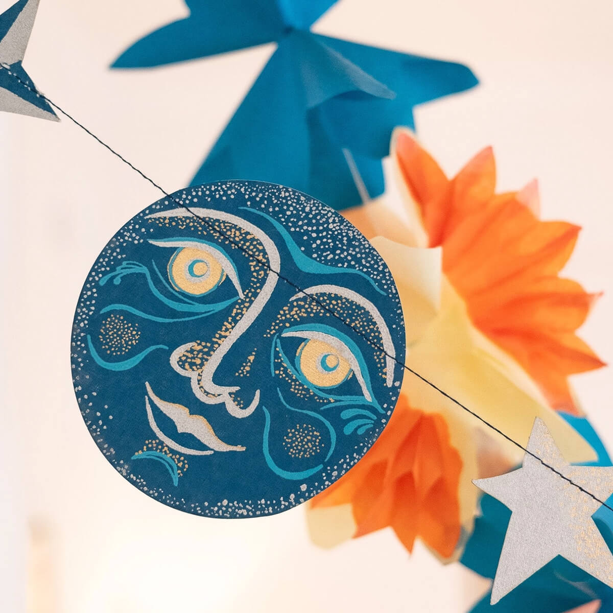 Man On The Moon Paper Garland by East End Press. Enchanting moons and shimmering stars cast their magical glow onto the dreamers below. Includes a mix of twenty celestial themed shapes along three metres.