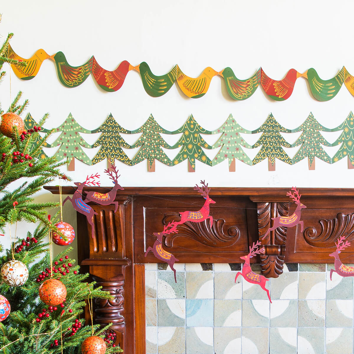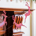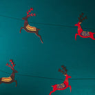 Reindeer paper garland by East End Press. Hand printed three metre long paper garland, featuring ten screen printed Christmas reindeer. The garland is printed on both sides on thick, hand made cotton paper. The shapes are sewn in a random order along strong cotton thread, with hanging loops either end, meaning the garland can be hung straight away.