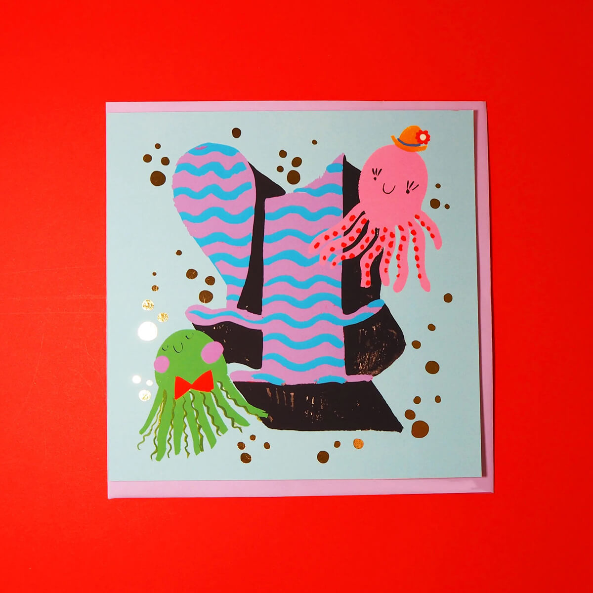 Age 4 birthday greetings card by Eleanor Bowmer. Cute octopus themed 'Age 4 Card' with gold foiling details. Features an illustration by Eleanor Bowmer. Made from premium card stock with a luxurious silk texture and gold foil printed details. Blank inside for your own message.