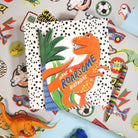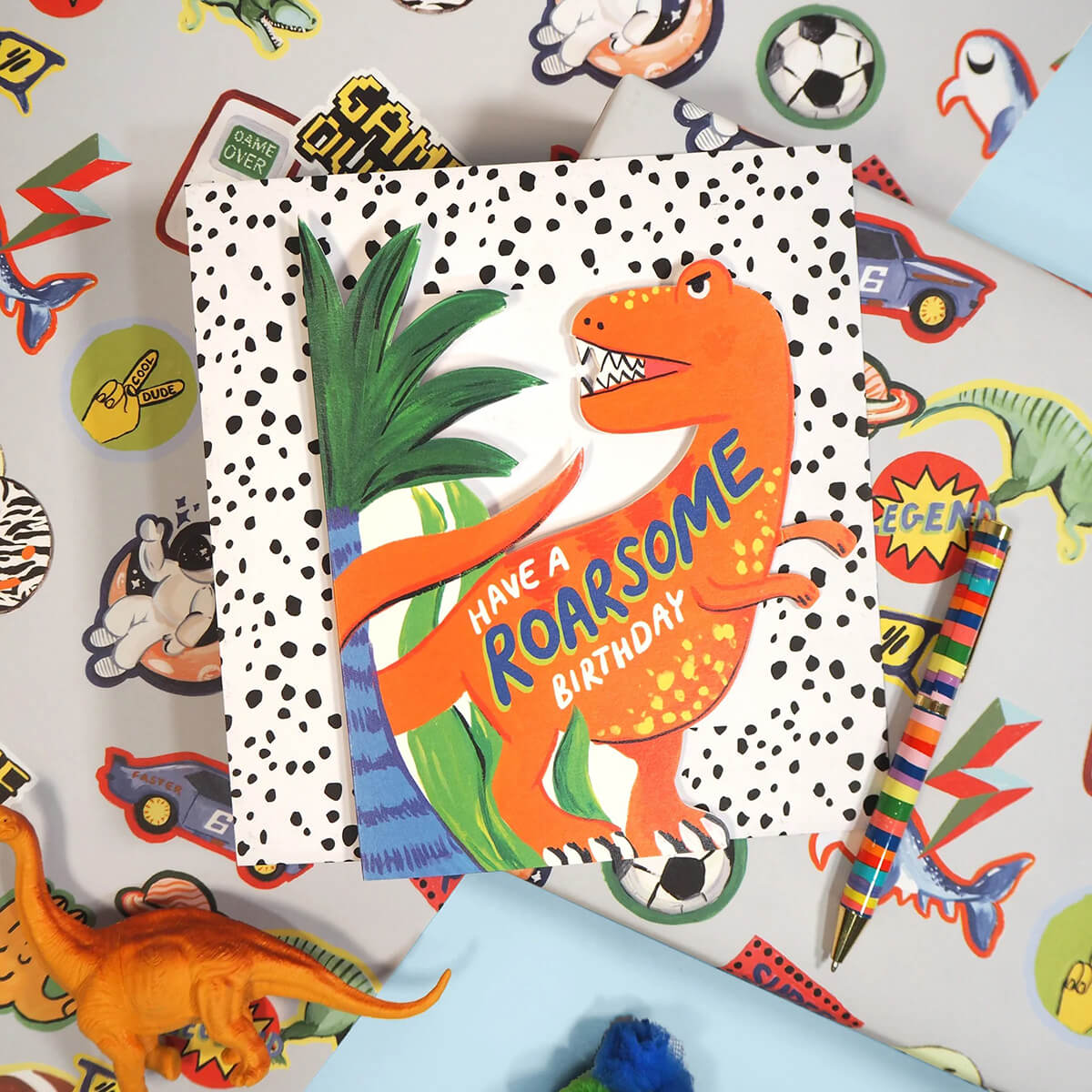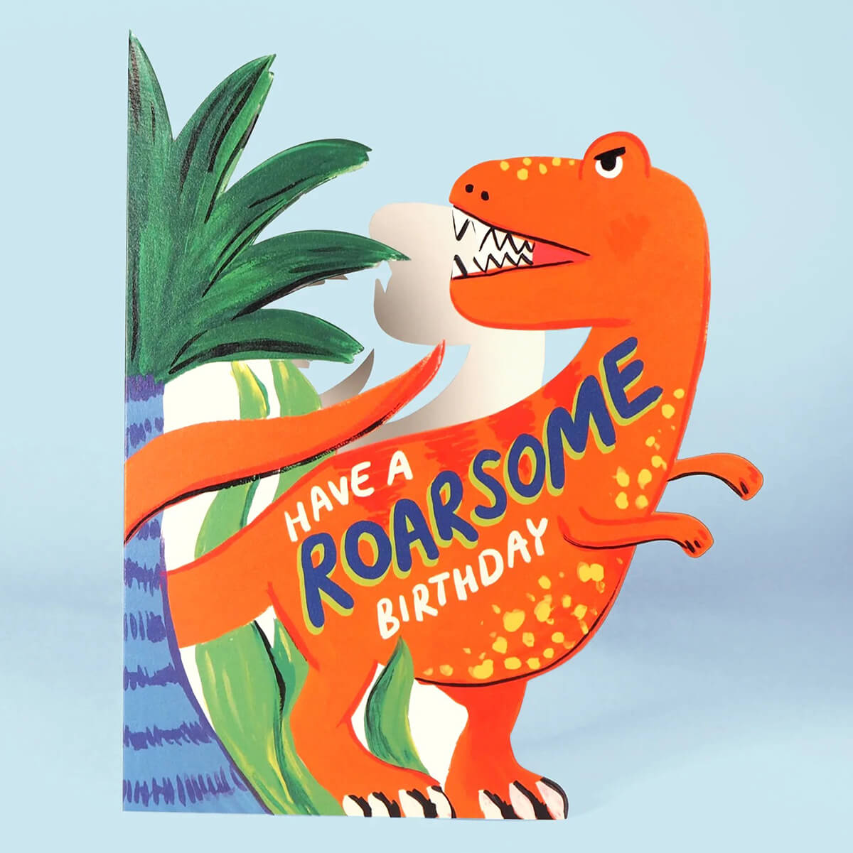 Dinosaur shaped greetings card by Eleanor Bowmer. This fun Dinosaur shaped card has an orange-illustrated dinosaur against a jungle backdrop and is cut-out to make the card pop while it's on display. The special message across the dinosaur reads 'Have a roar-some Birthday' and is perfect for dino-loving kids! Roarrrrr! Made from premium card stock with a luxurious silk texture. Blank inside for your own message.