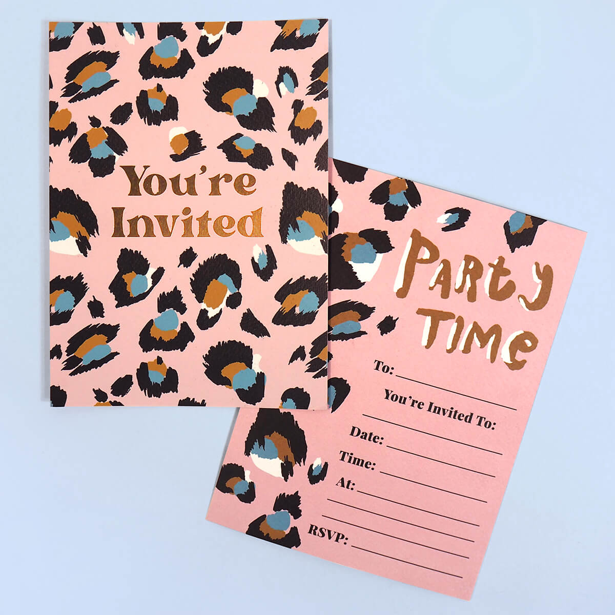Pink Leopard party invitations by Eleanor Bowmer. One for leopard print lovers! These blush pink party invitations feature the iconic Eleanor Bowmer leopard print across both sides of the invite and fun party messages. On the reverse, there's plenty of space for you to write the party details, including the date, time, location and how to RSVP. Each invitation comes with its own envelope and you'll receive 10 per pack.