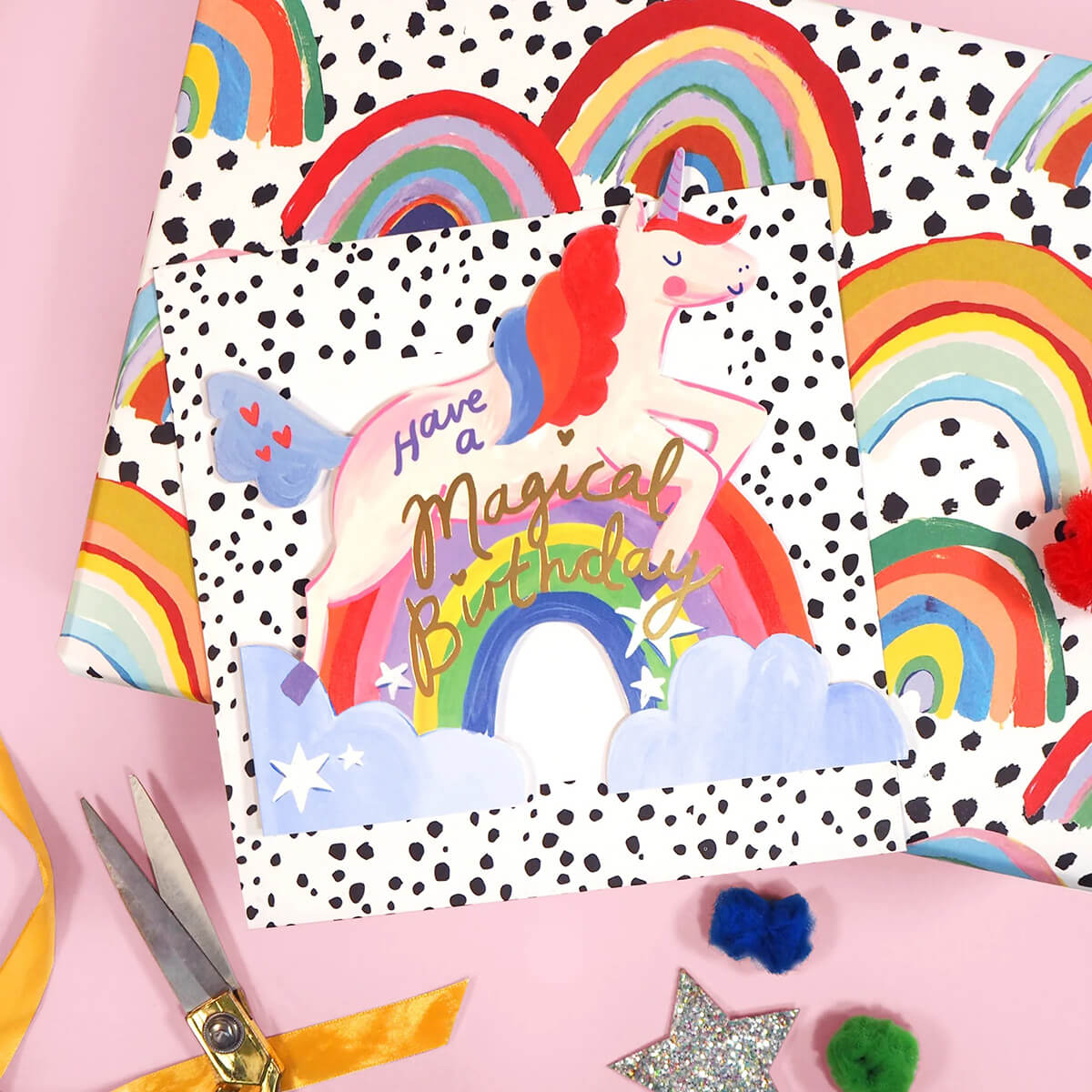 Unicorn shaped greetings card by Eleanor Bowmer. A unicorn, rainbow and fluffy clouds, what more could you wish for? This unicorn-shaped Birthday card is perfect for unicorn-loving kids and features a beautiful 'Have a magical Birthday' message across the front, with touches of gold foil to add extra shine to this super cute greetings card. Made from premium card stock with a luxurious silk texture and gold foil printed details. Blank inside for your own message.