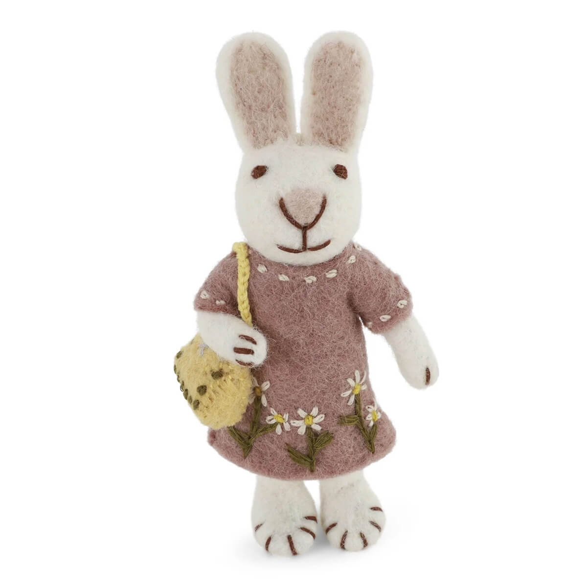 White Bunny Hanging Decoration by Gry & Sif. A sweet hanging bunny decoration with string. The bunny is wearing a lavender felt dress with flower embroideries and is carrying a yellow felt purse. A beautiful soft hand-felted Easter decoration. Handmade and truly unique. Suitable for all your Easter festivities.