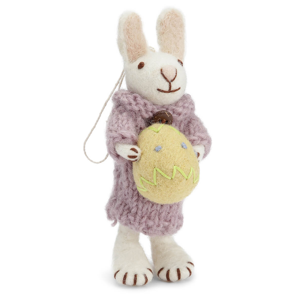 White Bunny Hanging Decoration by Gry & Sif. A sweet hanging bunny decoration with string. Thje bunny is wearing a purple knitted dress and carrying a yellow felt Easter egg. A beautiful soft hand-felted Easter decoration. Handmade and truly unique. Suitable for all your Easter festivities.
