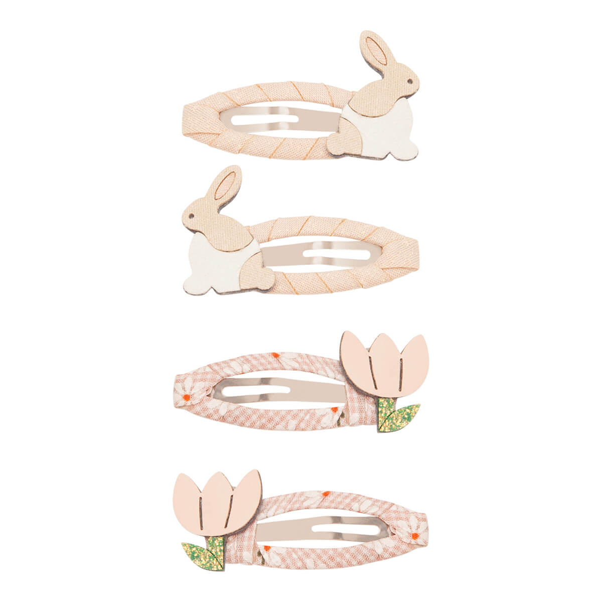 Bunny And Flower Clic Clac Hair Clips by Mimi & Lula. Two playful little bunnies and two soft pink tulips make up this dreamy little springtime clip set! This pretty pack would make a wonderful Easter gift.